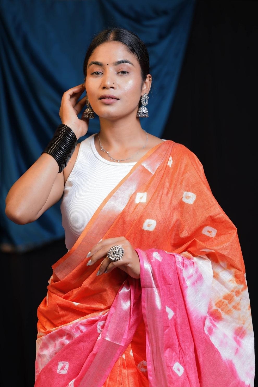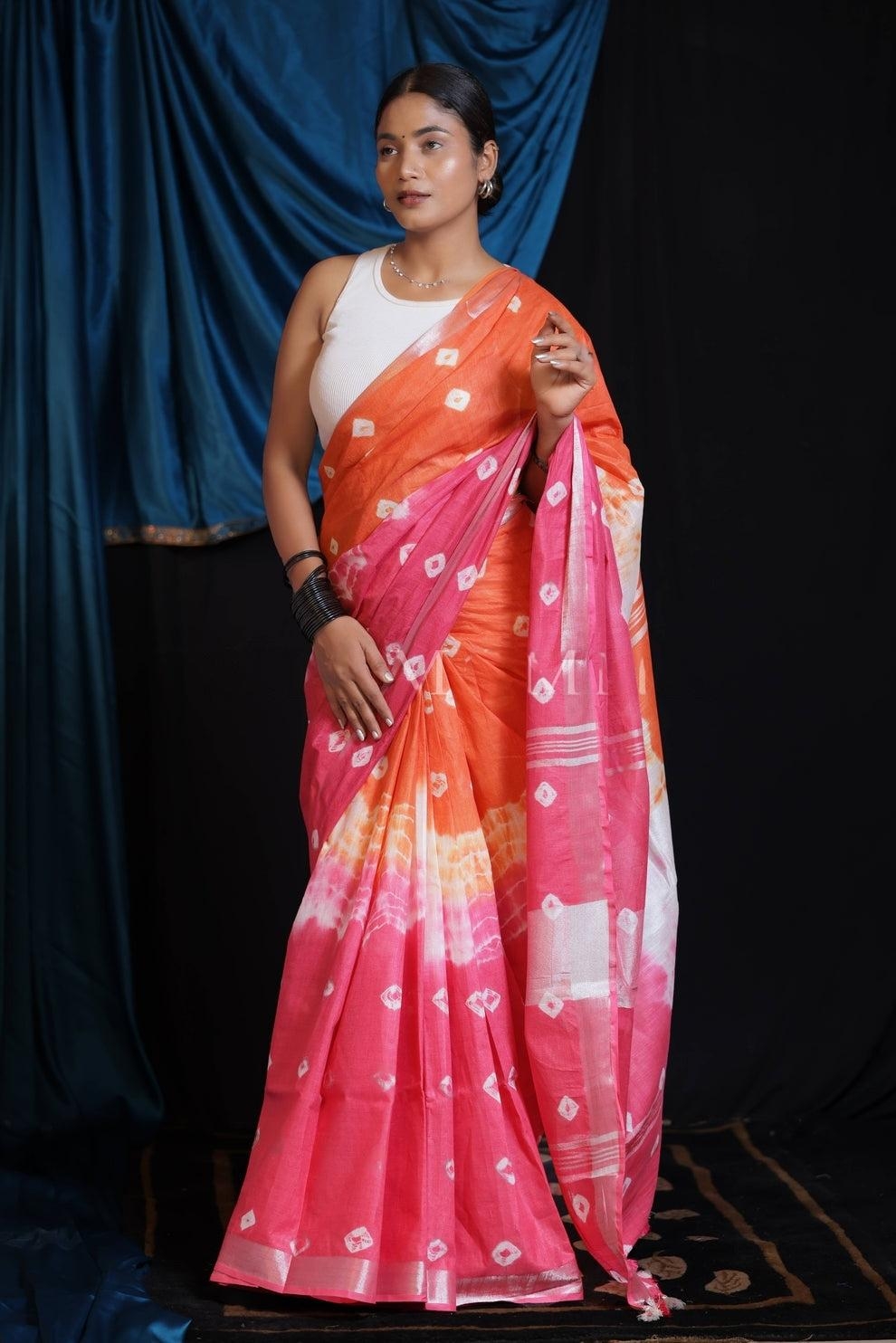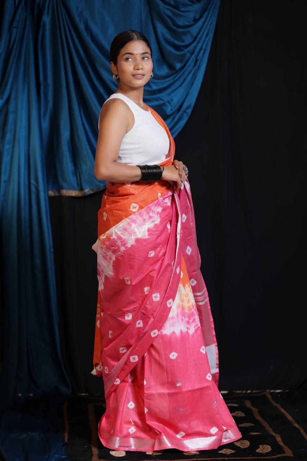 Tie & Dye Linen Cotton Saree | Orange & Pink