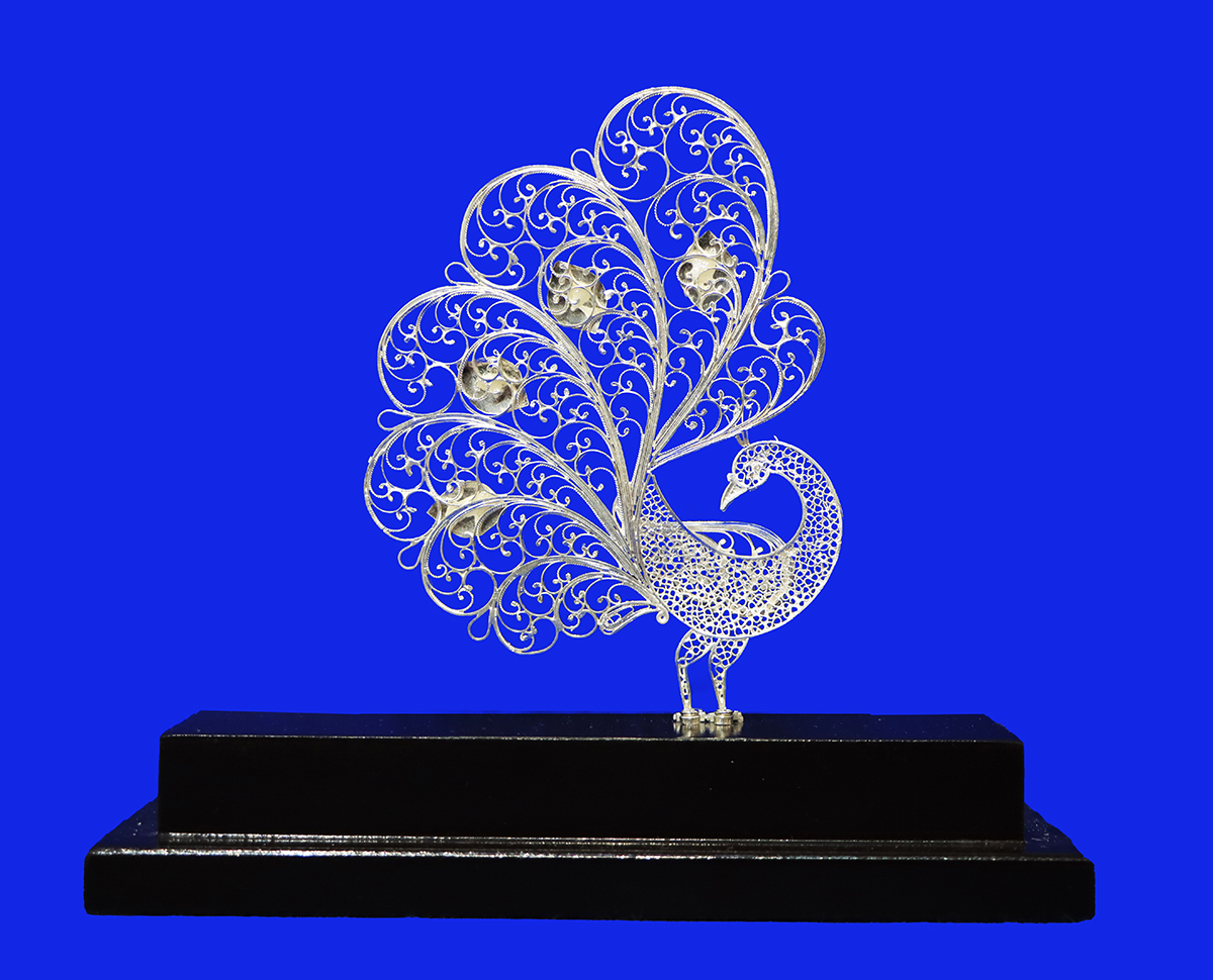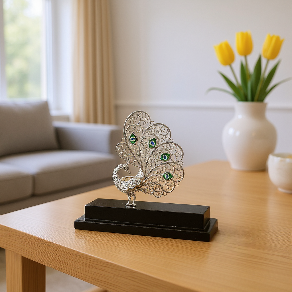 Silver Filigree Peacock (92.5 Sterling Silver). Expertly handcrafted by skilled artisans, this decorative piece showcases the timeless beauty of filigree work, a delicate craft that involves twisting fine silver wires into intricate lace-like patterns. The swan, symbolizing grace, purity, and beauty, makes for a stunning collectible or gift item.