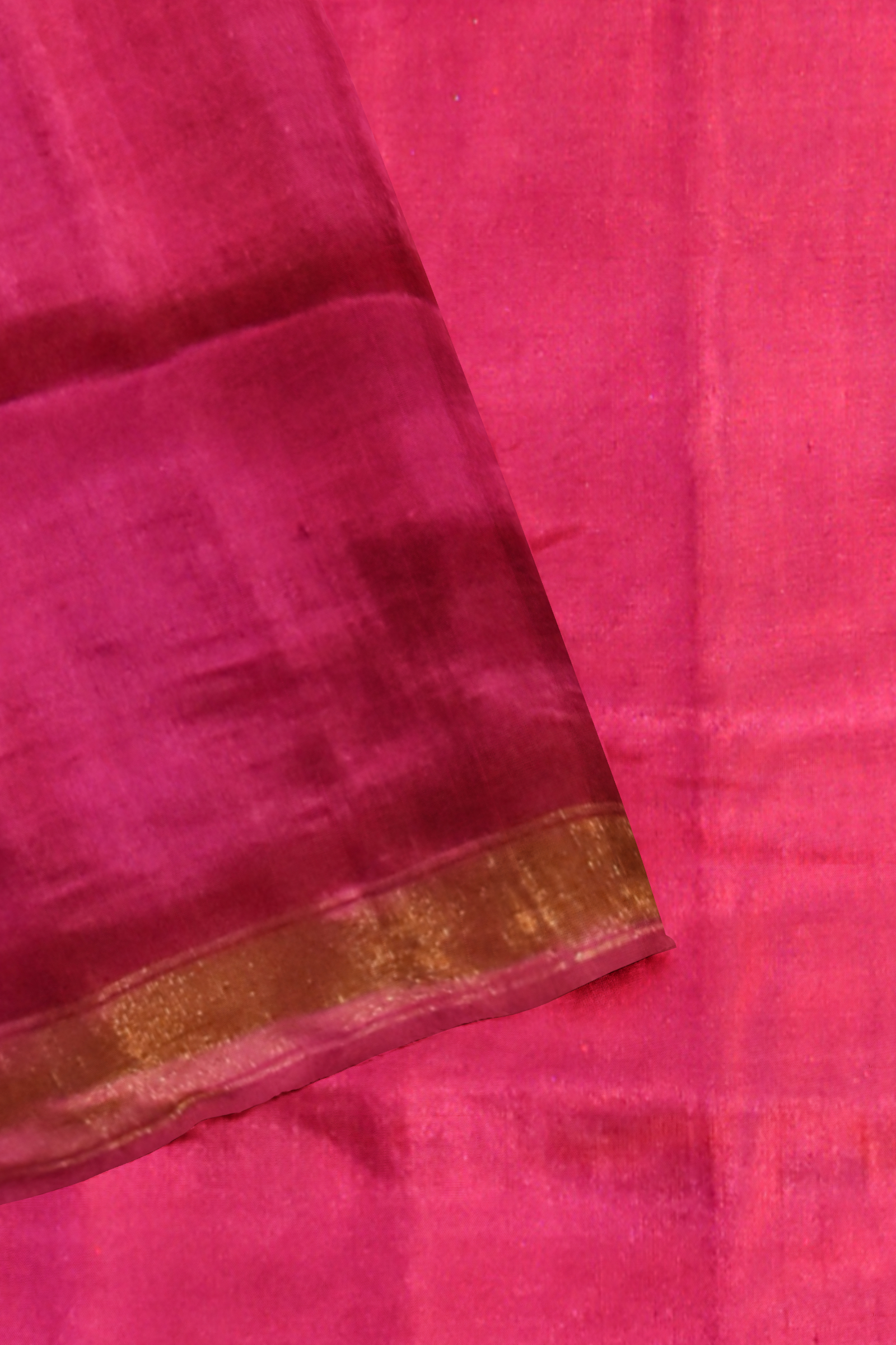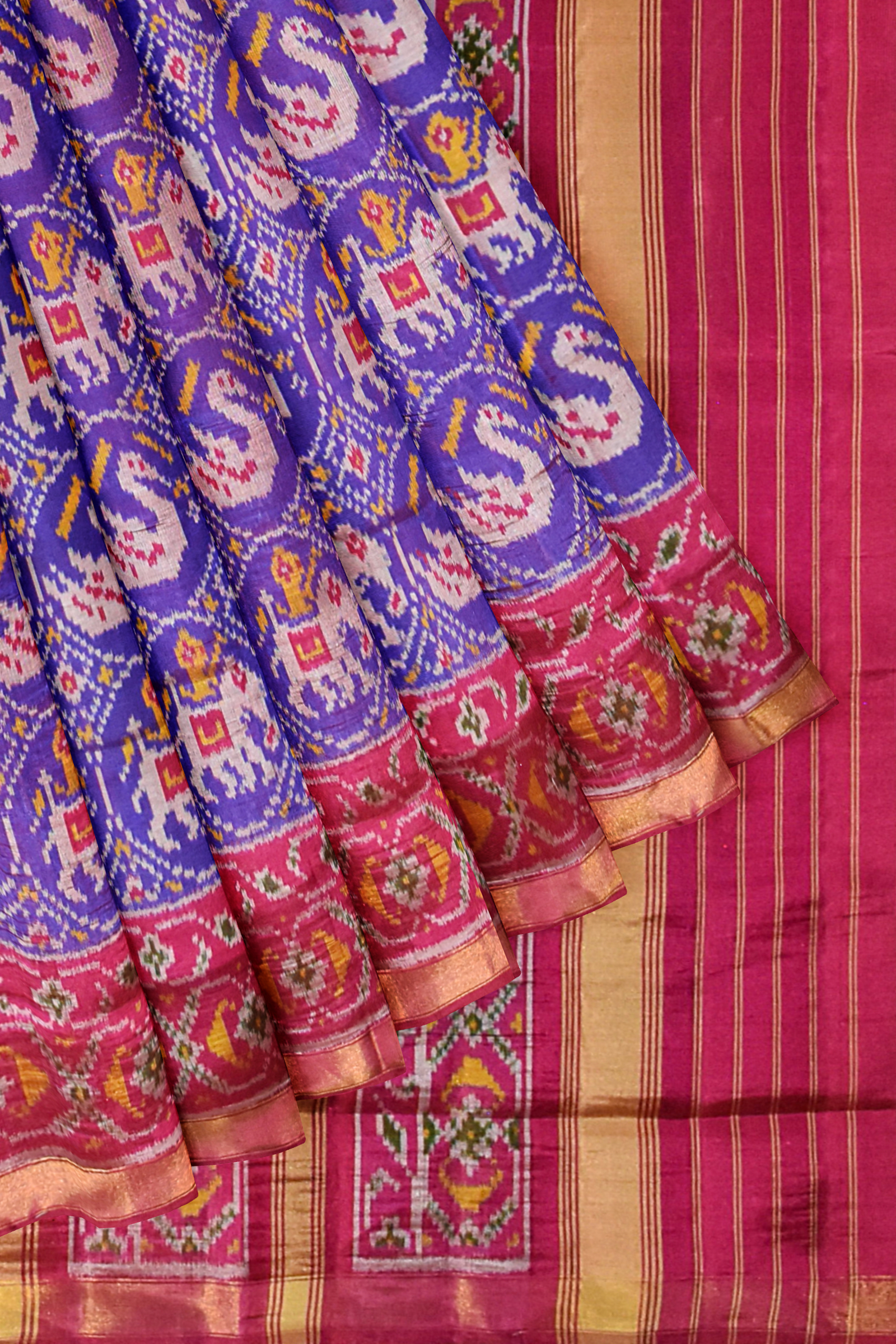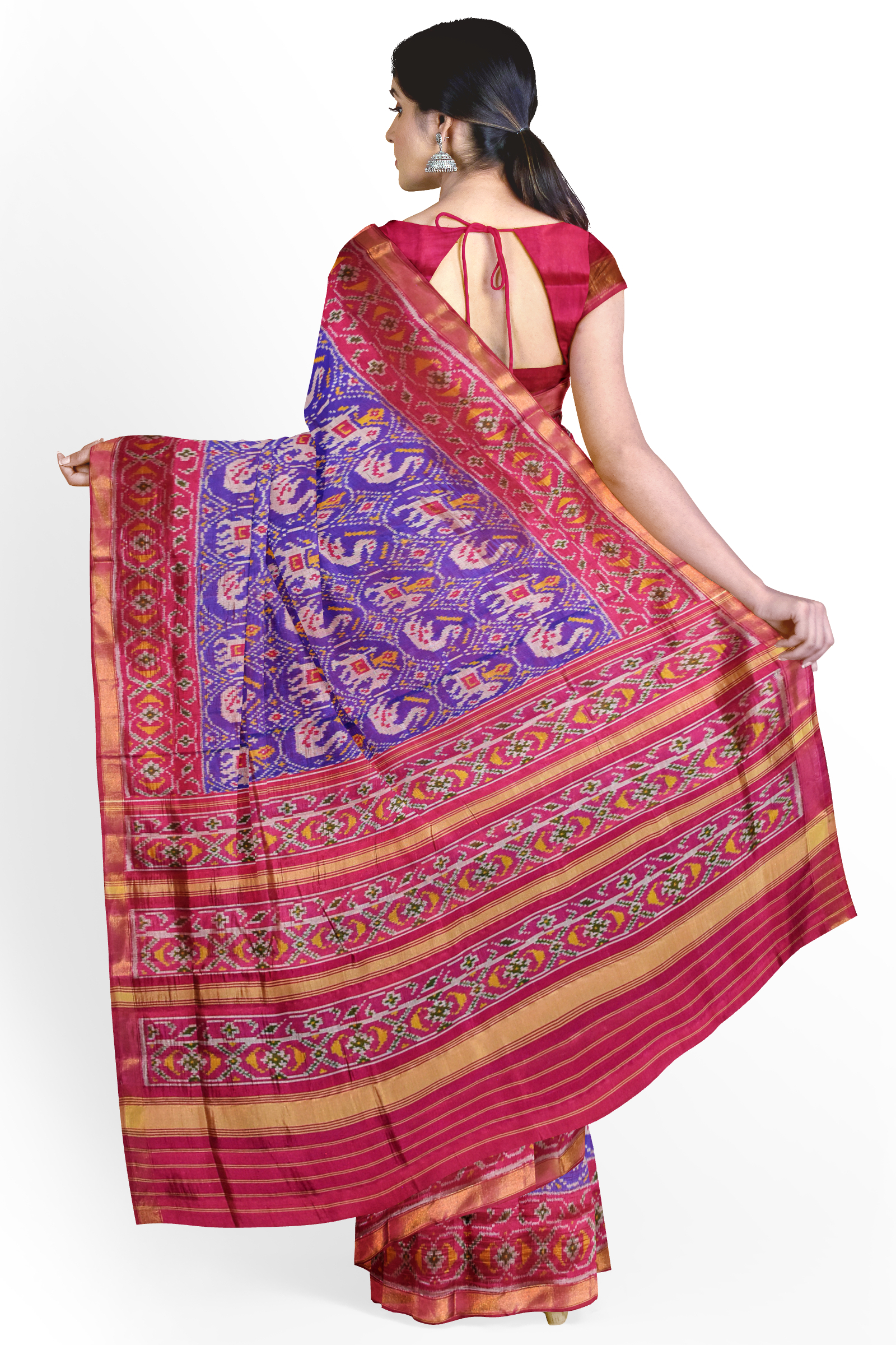 Single ikkat Patola silk saree Purpal,Pink mulberry silk handwoven saree from master weavers of Gujarat. Traditional ‘Animal figure design’ patterns are woven for this saree in shimmering dual shaded silk. The saree borders are highlighted with small zari interwoven as broad stripes. Showcasing magnificent design and crafted in pure silk features handwoven patola saree. Pair this saree with a beautiful blouse which will make you look elegant. It is handcrafted in pure Mulberry silk for utmost comfort and style.