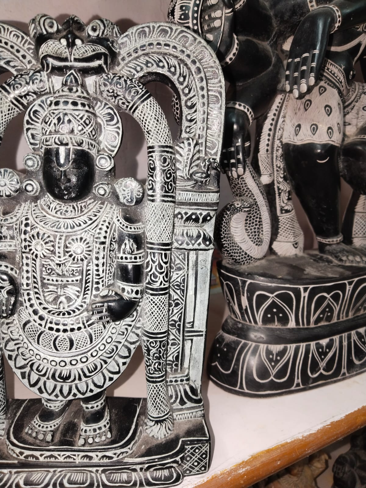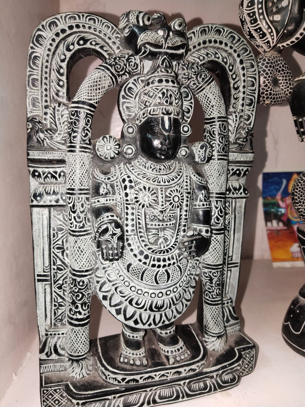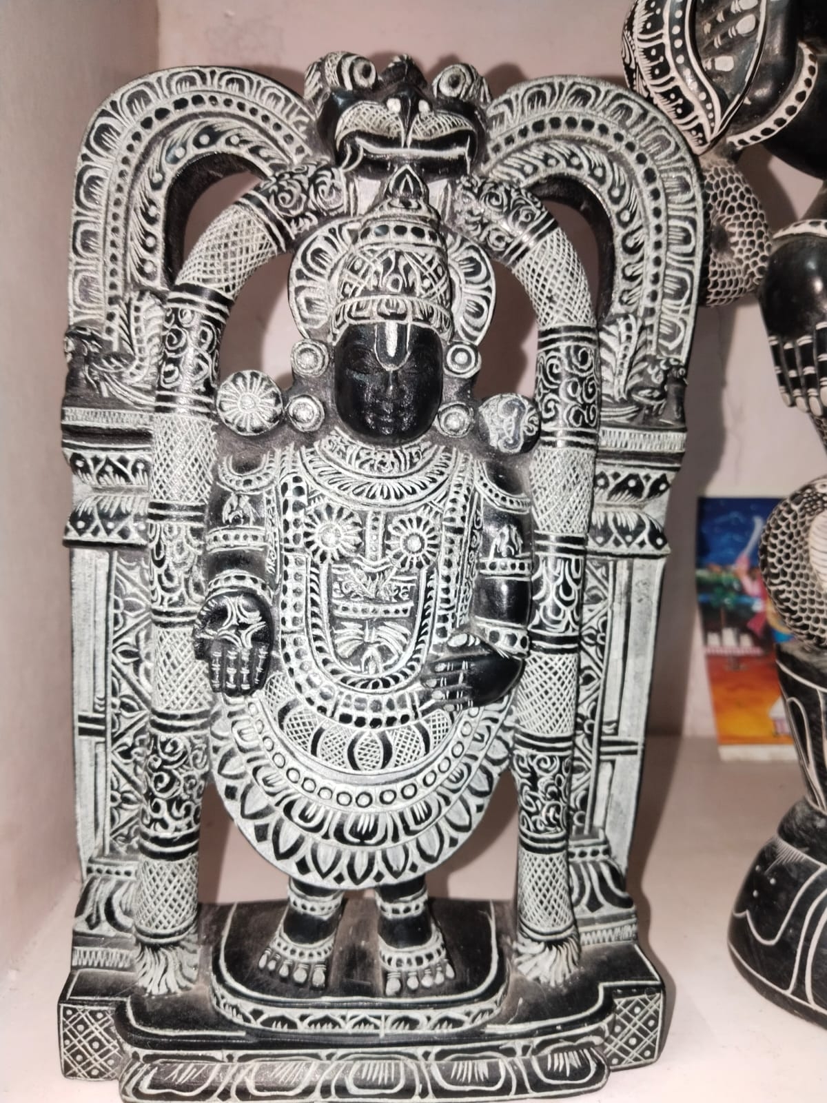 THE TRADITINAL SOUTH INDIAN TEMPLE STONE CARVING GREEN STONE POLISH IN BLACK WITH SCULPTURE DETAILING RICHLY JEWELRY DETAILED DECORATION CARVED THE LORD VENKATESHWARA TIRUPATI THIRUMALA STATUE