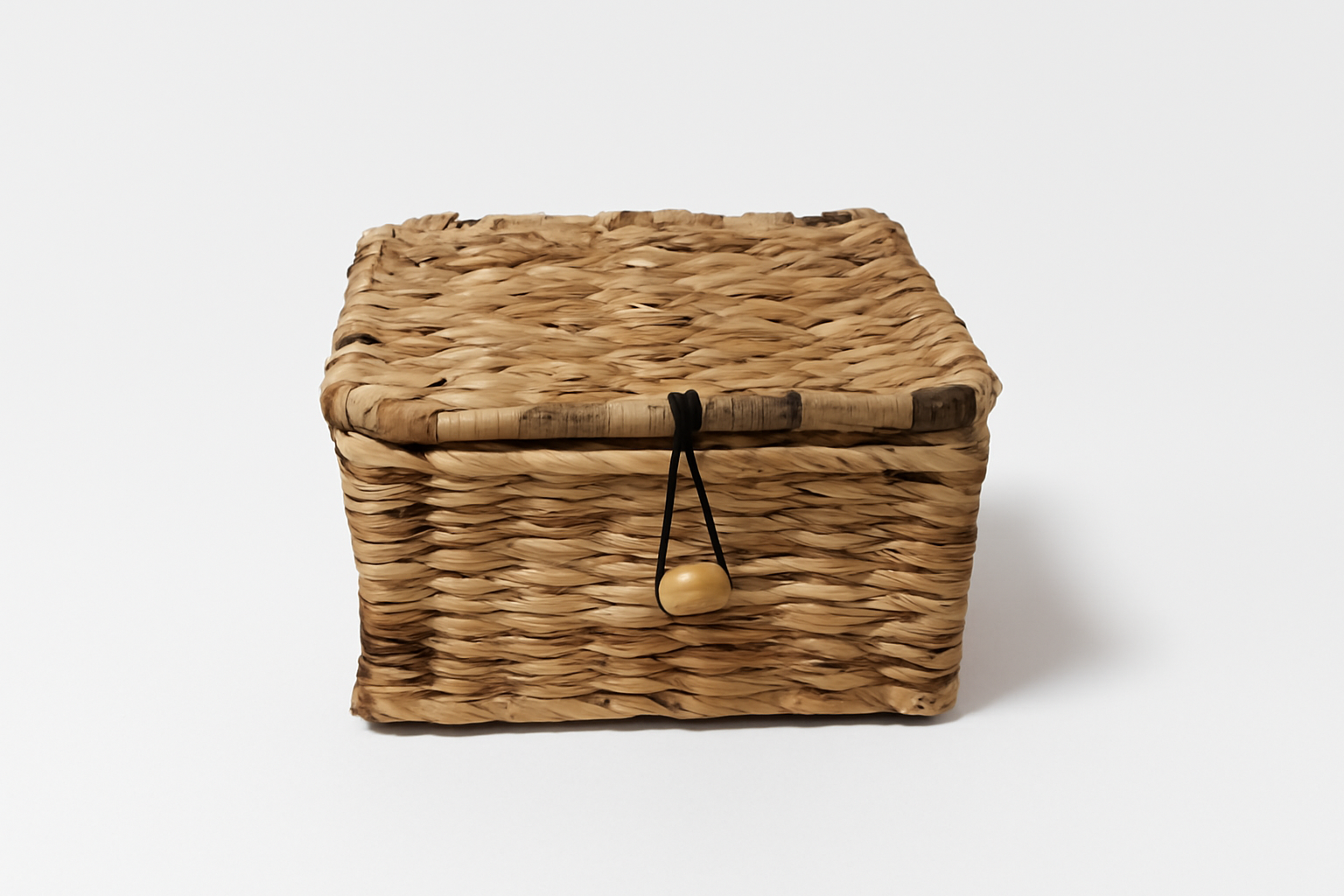 . Square box with a sung-fitting lid, secured with an elastic loop and wooden bead.