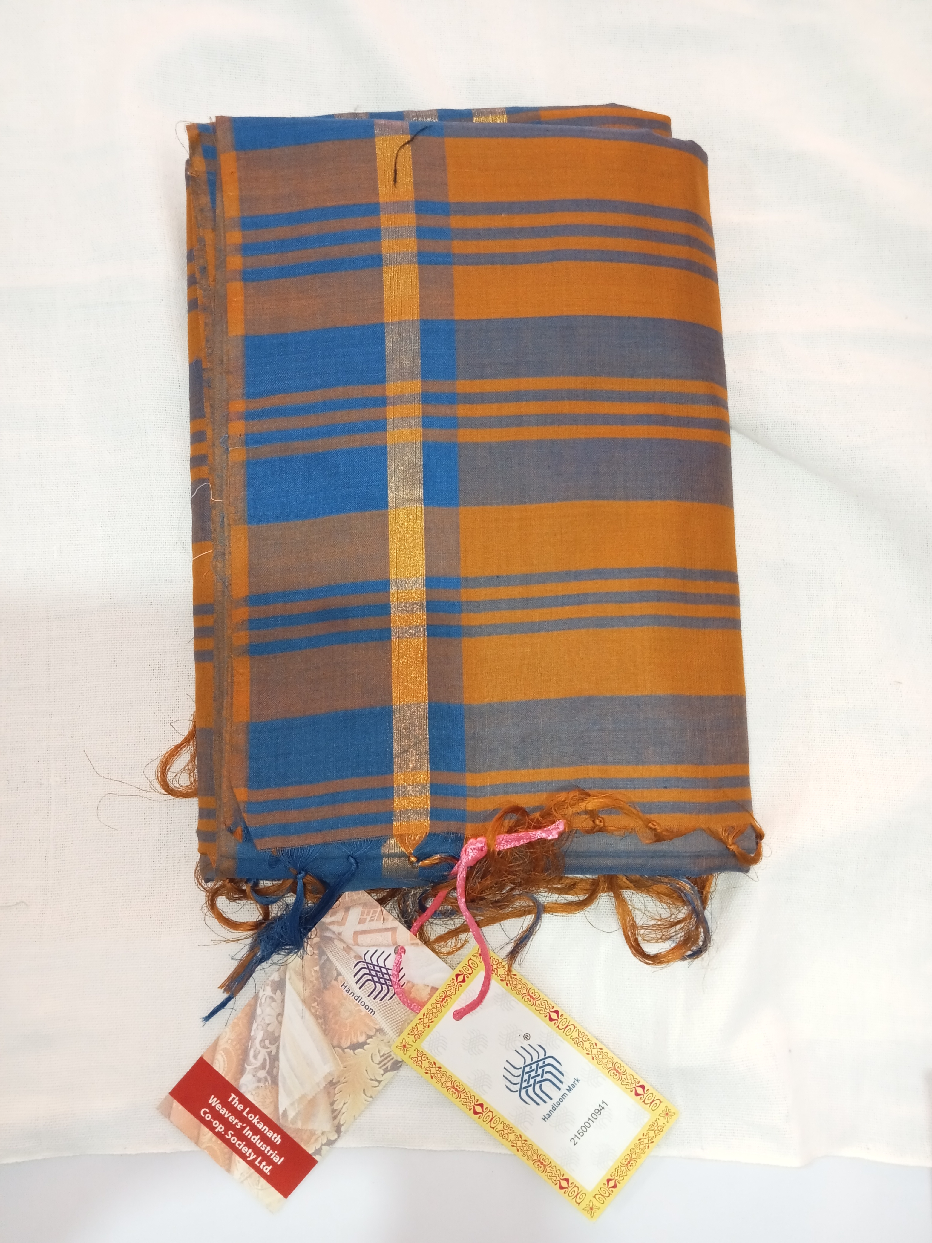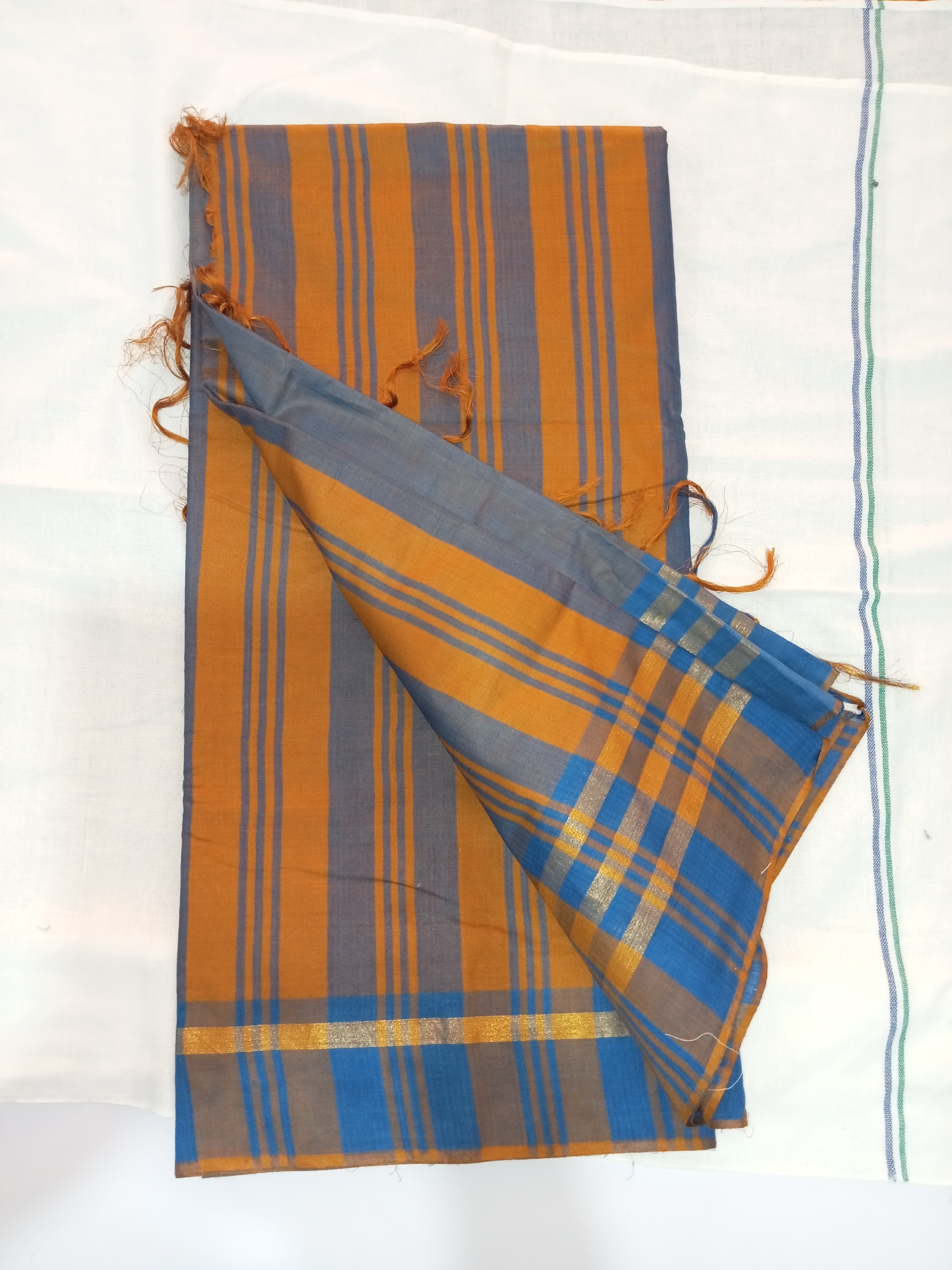 A striped pure cotton saree woven by using handloom with blouse at Lokanatha Handloom Co-op Society, Kannur , Kerala. This saree has zari extra threads for casual ocasions