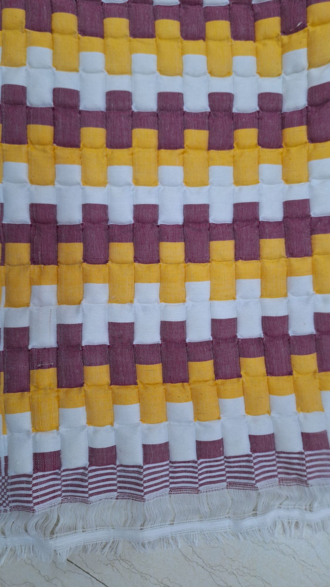 Sujni quilts are made using a double-weave technique: two layers of fabric are woven simultaneously, and cotton filling is inserted between them during weaving, so there's no need for stitching afterward ,Typically, two artisans work side by side, weaving shuttle threads and stuffing the cotton in pockets created within the weave,