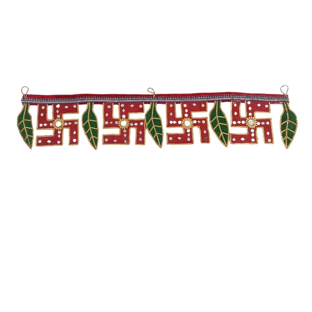 Enhance your doorway with this vibrant Swastik & leaves Toran, featuring the sacred Swastik symbol handcrafted with colorful Lace, velvet & Mirrors. A symbol of positivity and prosperity, it's perfect for festive décor and daily auspicious display.
