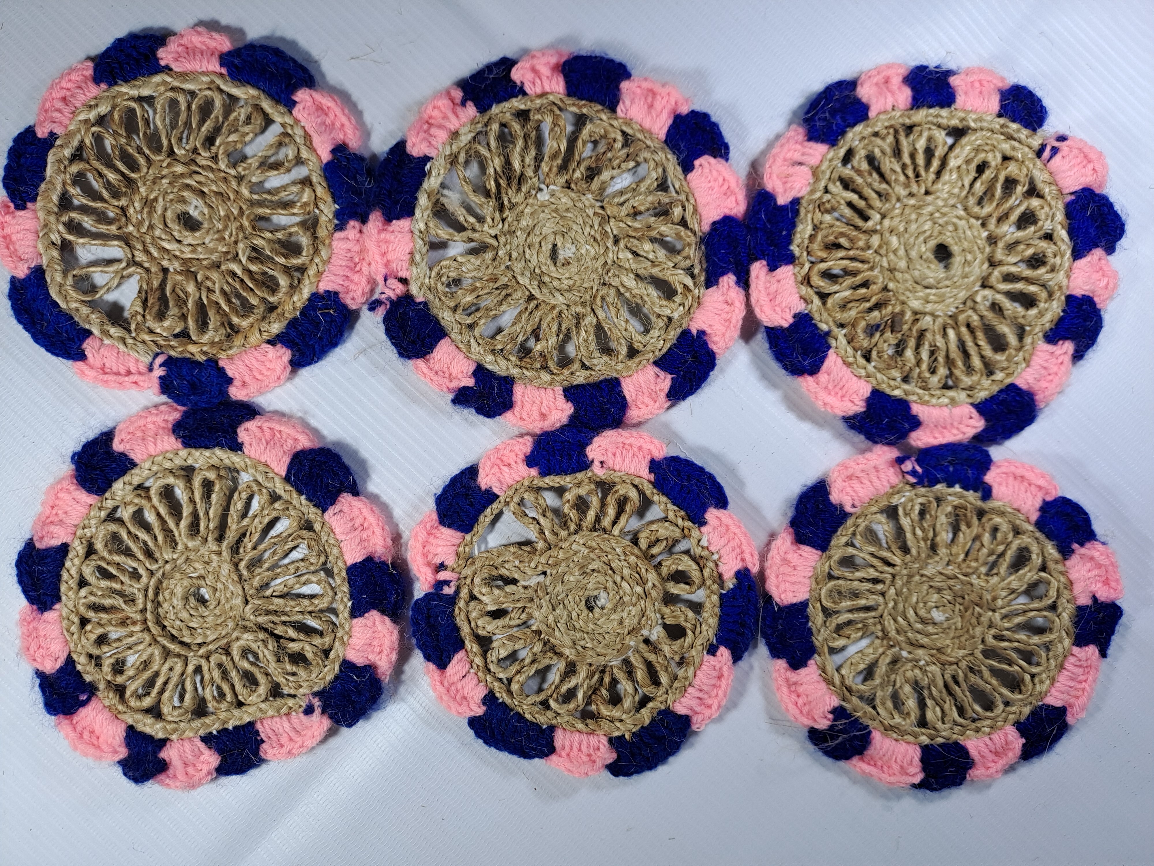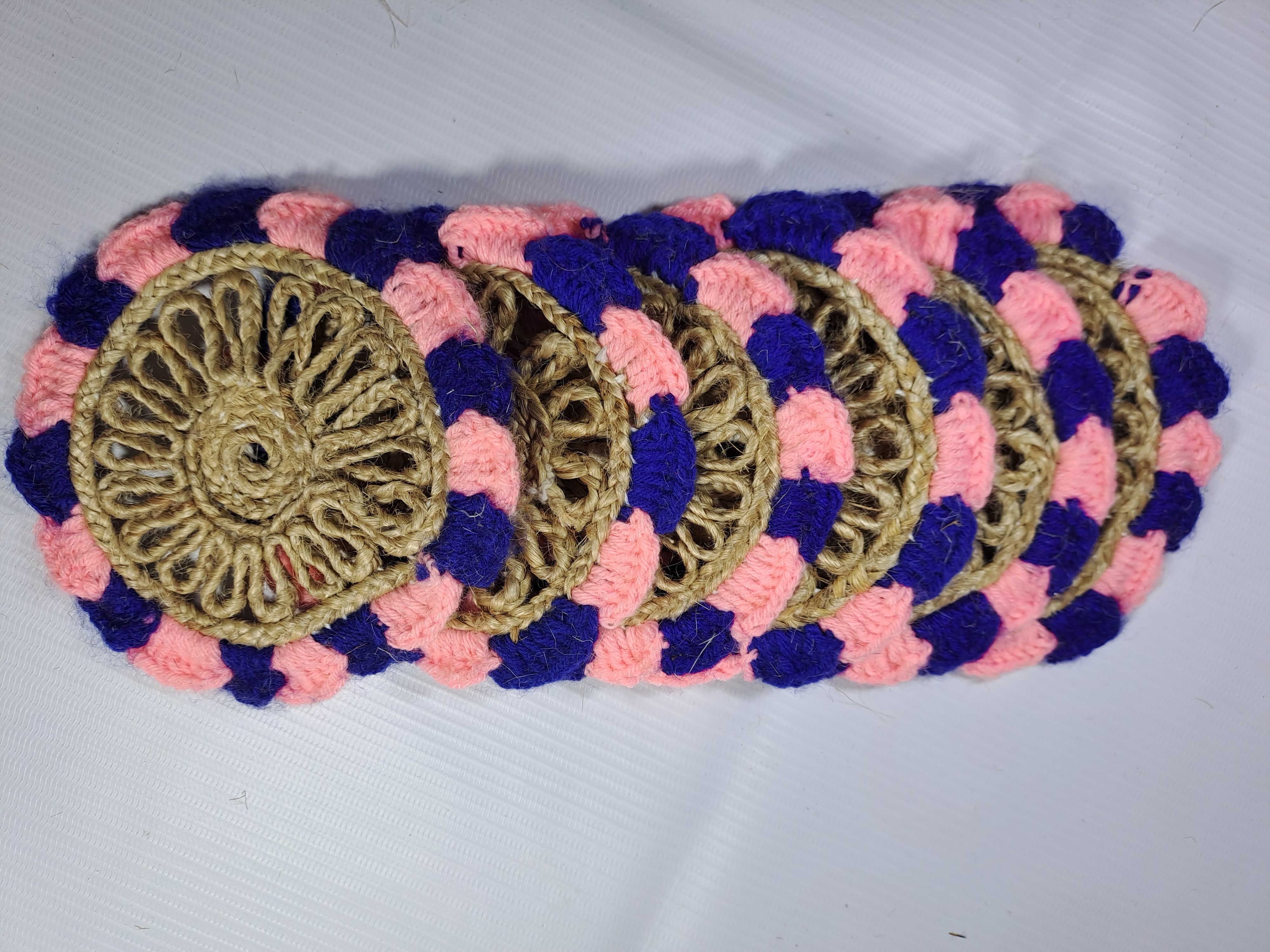 Experience the regal charm of finely crafted natural jute hand braided rustic vintage Tea Coasters in attractive Pink & Blue colour shade for dining table, bedside table, tea coaster, chutney, saucer mat, decoration mat, coffee mugs mats, tea pads and heat pads etc. Jute braided coasters brighten your tabletop with braided round placemats. Good choices for family daily use, home, kitchen, hotel, restaurants, cafes or business office. This product is made from natural jute fibers this placemat is beautifully textural with subtle multi colouration that will bring a unique and natural looking element to any occasion. Brighten your tabletop with braided round placemats; showcase your dishware with stylish round placemats, framing plates with colour and texture as they catch drips and crumbs saving your tablecloth from stains. Good product for wedding gifts, anniversary gifts house warming ceremonies, Birthday gifts, and festival gifts.