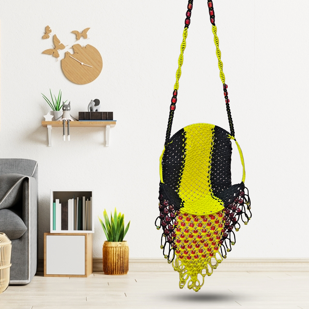 The handmade teddy bear jhula is a delightful handicraft from Uttar Pradesh, crafted with meticulous attention to detail. Made with macrame threads and an iron ring adorned with artificial objects, this charming piece is perfect for decorating your drawing hall or any other space.