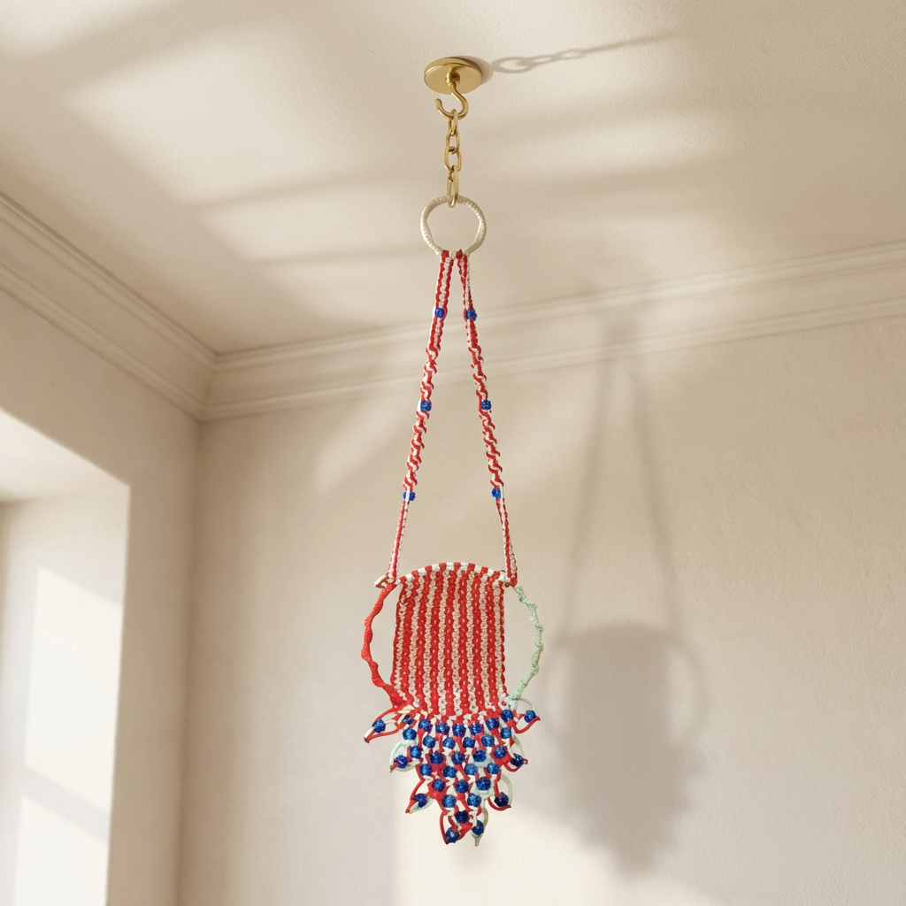 A BEAUTYFUL TEDDY BEAR JHULA MADE WITH MICROM THREADS AND IRON RING ARITIFICIAL OBJESTS IT IS USED TO DECORATE THE DRAWING HALL AND OTHER PLACES