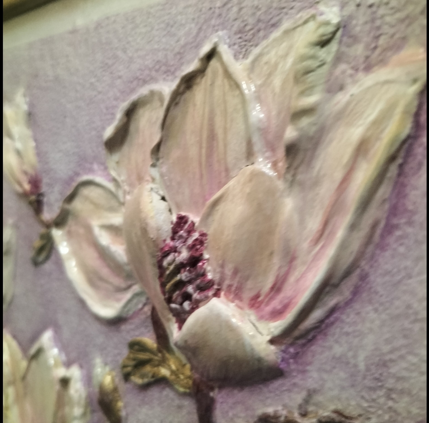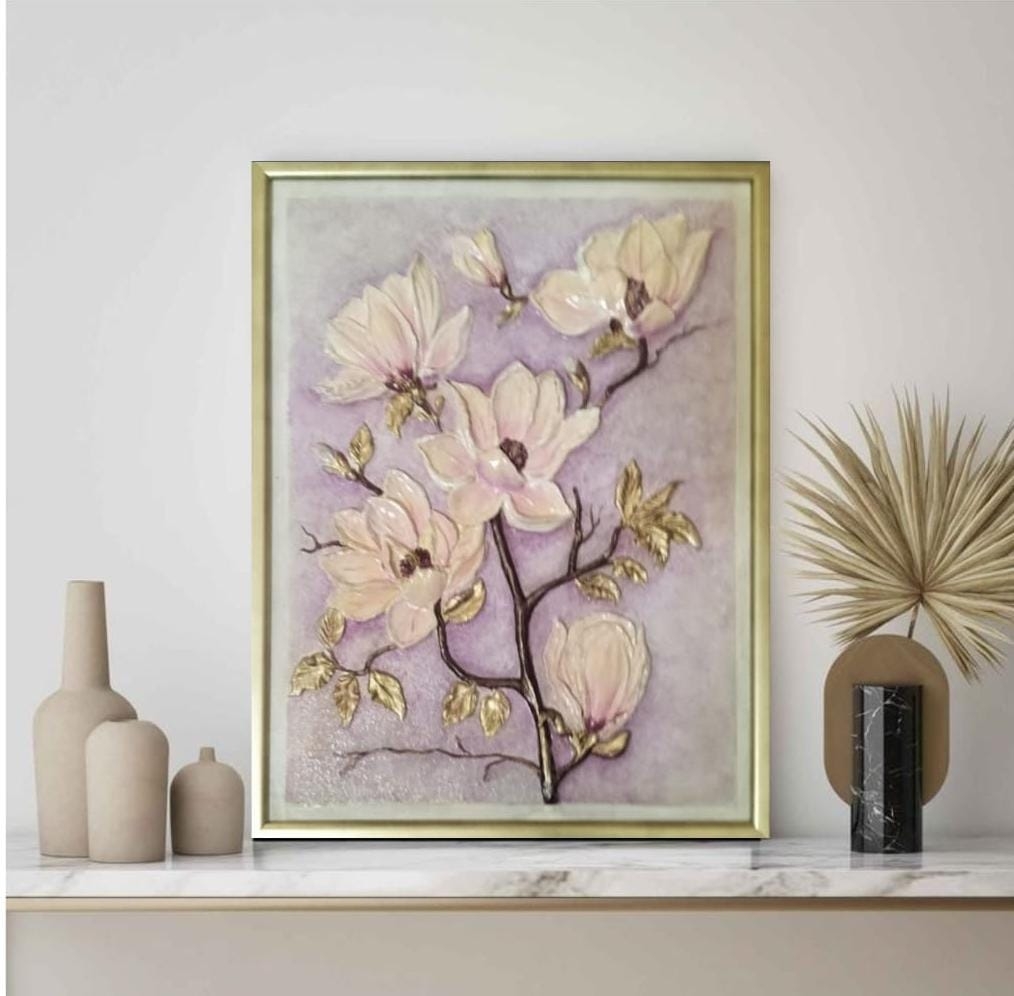 Serene, feminine vibe from magnolias' soft curves and pastel hues, ideal for Vastu-aligned calm.This textured magnolia artwork showcases blooming flowers in soft whites and pinks with golden leaves on a gentle purple canvas, evoking serenity and elegance. The raised impasto technique brings petals and branches to life, perfect for harmonious bedroom decor.