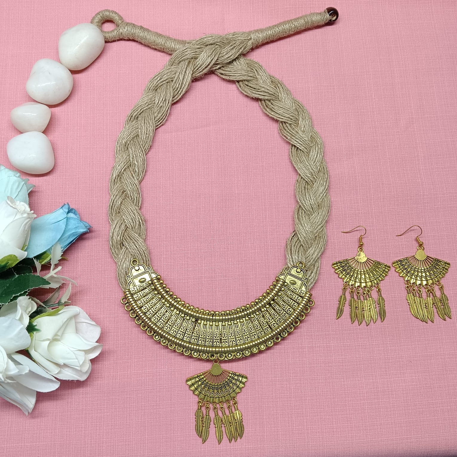 • Coordinated Boho Set – Necklace, jute-wrapped pendant & matching earrings
