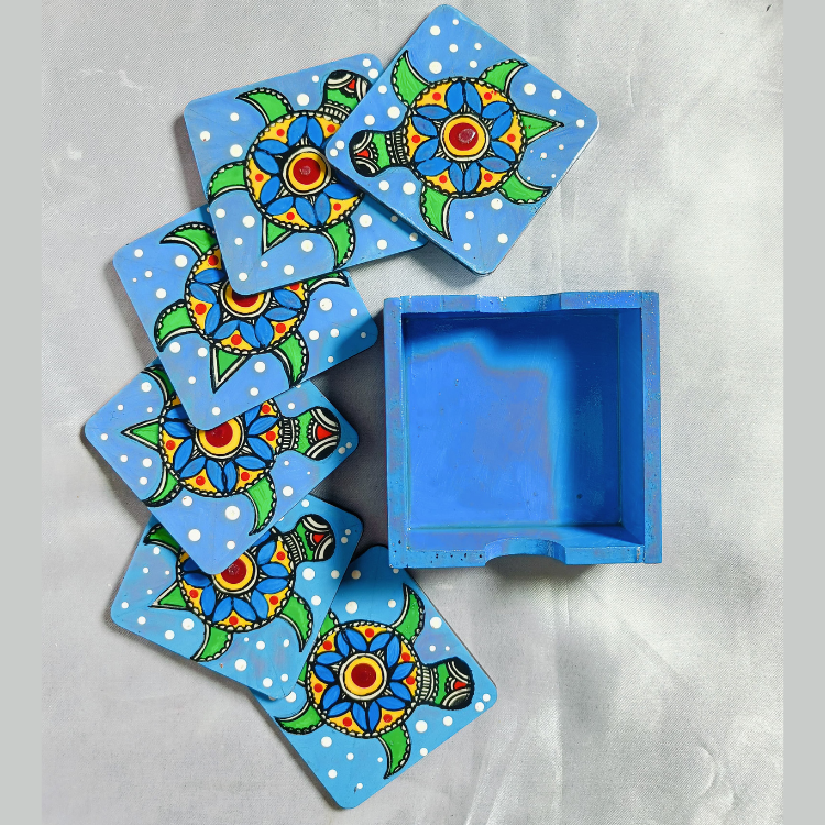 Add a touch of traditional elegance to your space with this beautifully handpainted Madhubani coaster set. Crafted on durable MDF wood, each coaster features intricate artwork inspired by folk art, bringing vibrant colors and cultural charm to your table. The set includes 6 coasters with a matching holder for neat storage. Perfect for protecting surfaces from heat and stains while enhancing your home décor, it also makes a thoughtful and artistic gift.