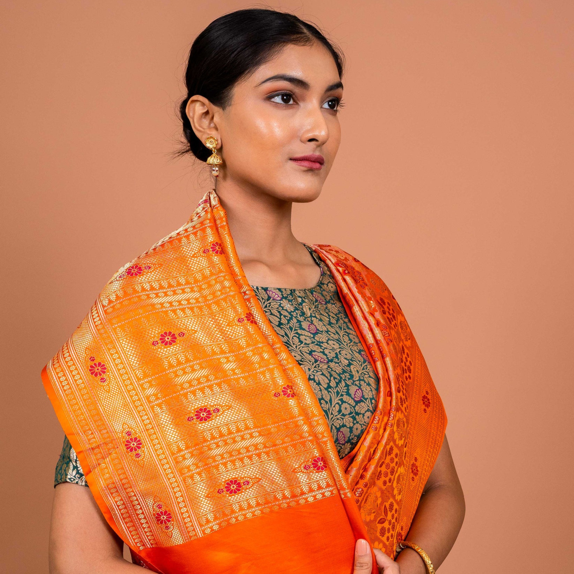 The Vana Tanchhoi Handwoven Banarasi Saree is more than just attire—it is a timeless work of art. Draped in a striking orange hue, this saree reflects the warmth and vibrance of dawn. Crafted using the traditional Tanchhoi weaving technique, it showcases the rich legacy of Banaras. Woven from the finest silk, it flows with effortless elegance, making you look graceful on every occasion. Each piece is meticulously handwoven by master artisans, ensuring exclusivity and unmatched craftsmanship. Whether for a festive celebration, wedding, or cultural gathering, this saree ensures you shine with confidence and sophistication.
