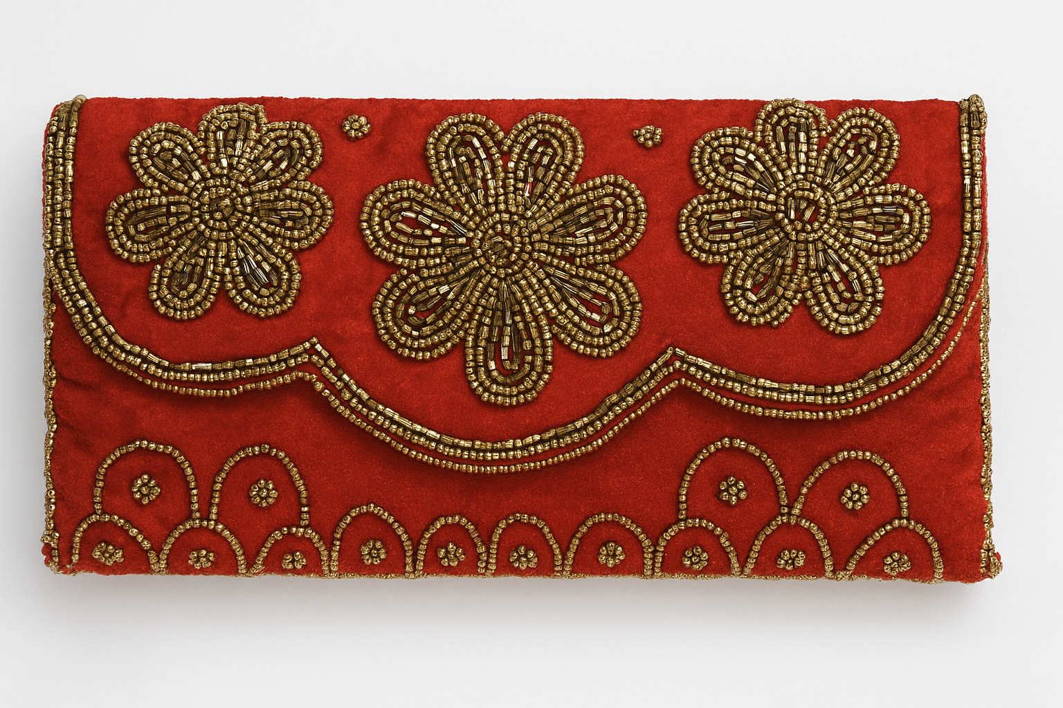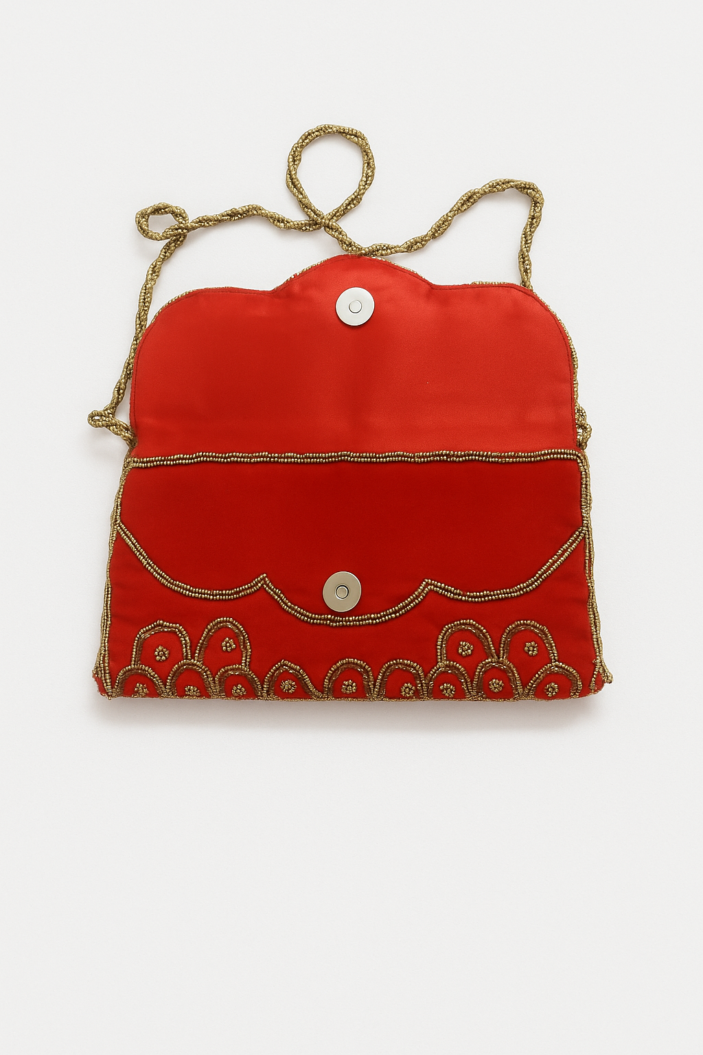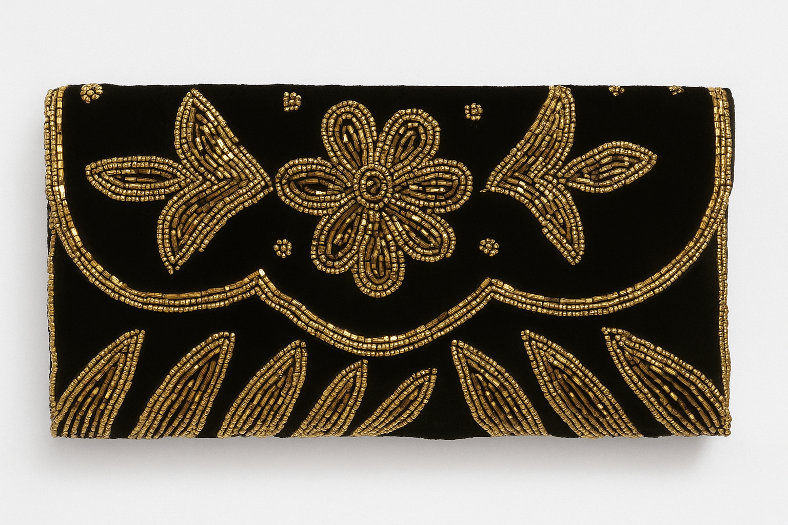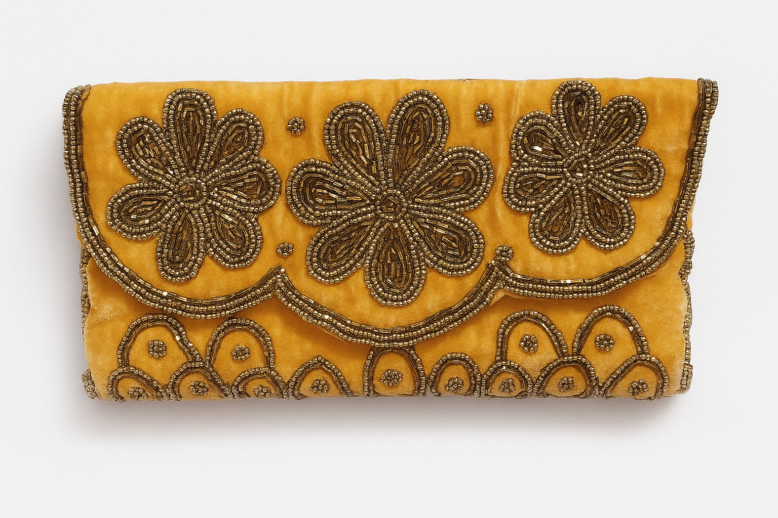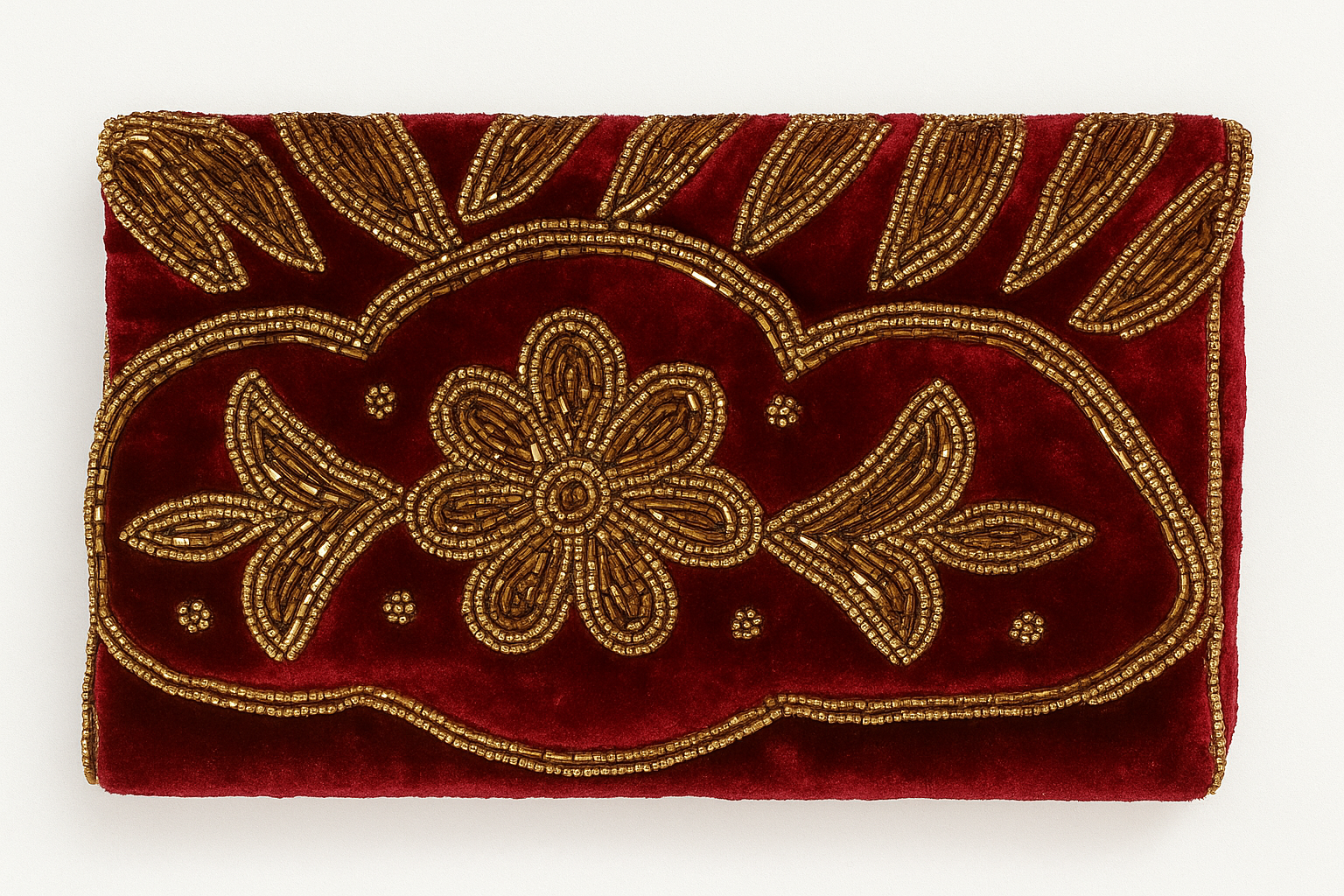 Velvet Clutch Bag for Women | Hand Purse with Golden Embroidery & Beaded Handle | Wedding & Party Wear Handbag