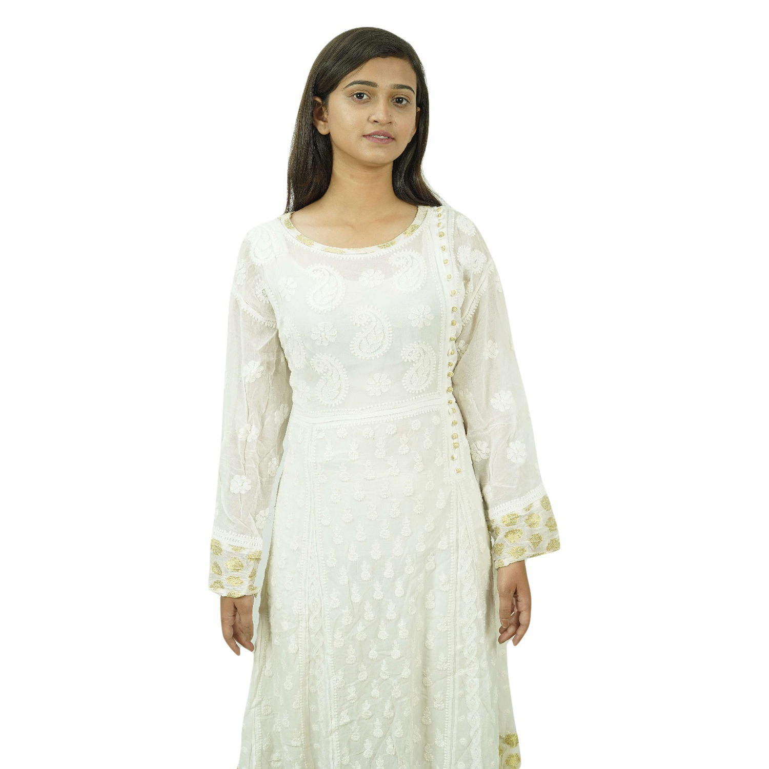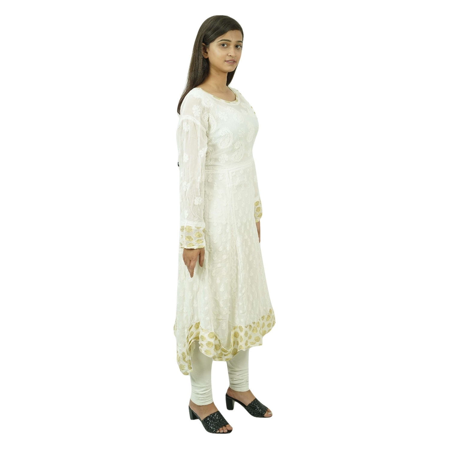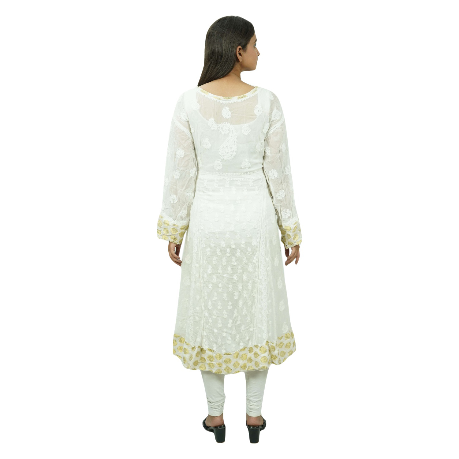 The White Viscose Chikankari Frock is a beautiful and elegant kurti that is handcrafted in India. It is made from fine-quality cotton and is adorned with delicate floral motifs. The kurti is perfect for any occasion, from a casual day out to a formal event.