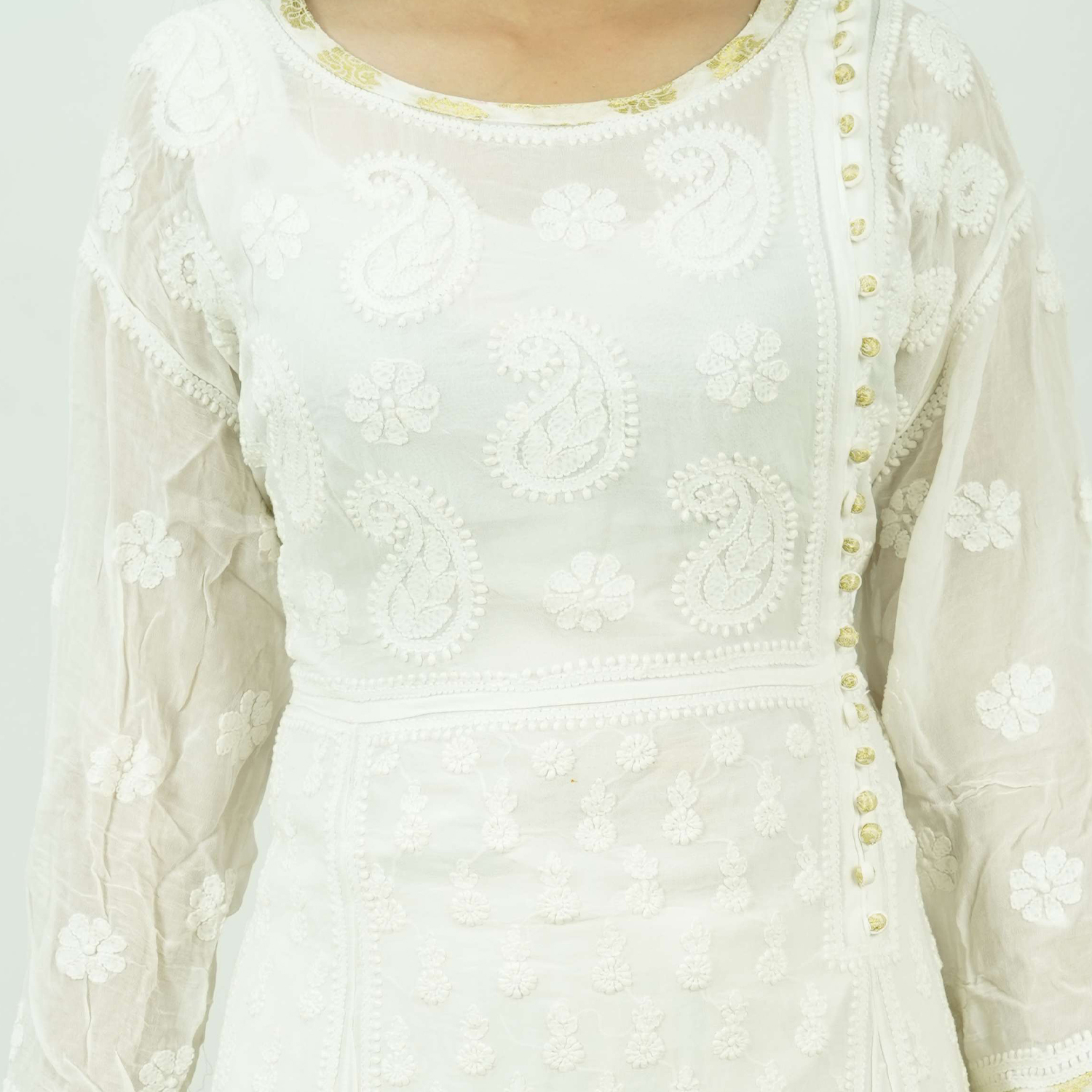 This Frock is an elegant and timeless addition to any wardrobe. Its lightweight material and comfortable fit make it perfect for hot summer days, while its subtle embellishments lend a touch of sophistication to any occasion. Whether dressed up with statement jewellery or paired with leggings and sandals for a casual day out, the chikan kurti is a versatile and stylish choice that can be worn by women of all ages and body types.
