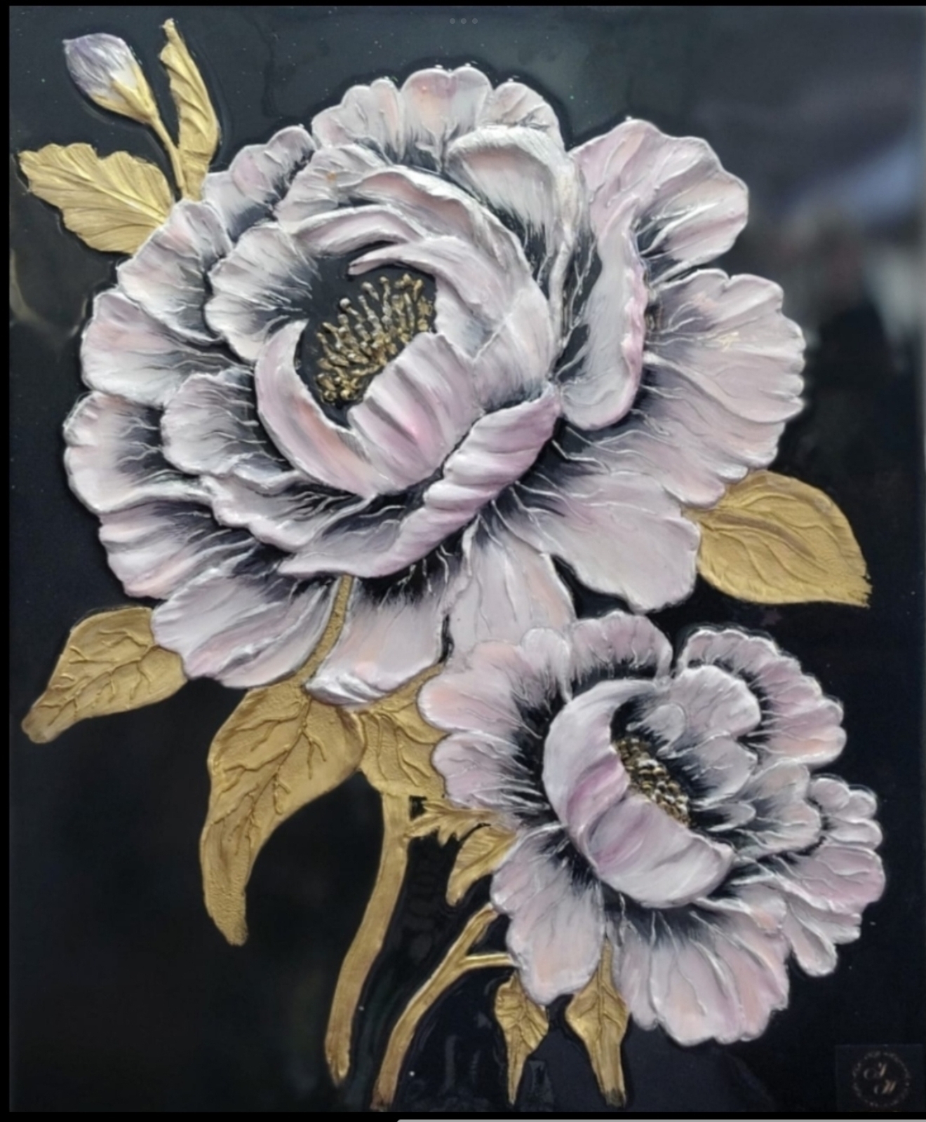 Textured impasto technique creates raised, lush petals that add depth and dimension to the peonies.
