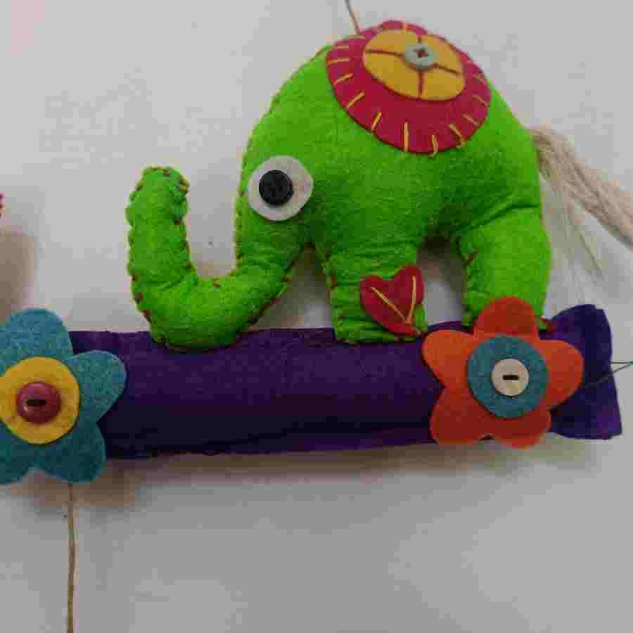Brighten up your child’s room with this adorable handmade felt elephant hanging décor. Featuring two colorful elephants sitting on a purple felt bar, accented with cheerful flowers and a dangling mini elephant, this piece is crafted from soft, non-toxic felt fabric. The vibrant colors, playful shapes, and detailed stitching make it a charming addition to nurseries, play areas, or as a thoughtful gift for baby showers and birthdays. Lightweight and easy to hang, this décor adds a touch of fun, creativity, and cultural charm to any space.