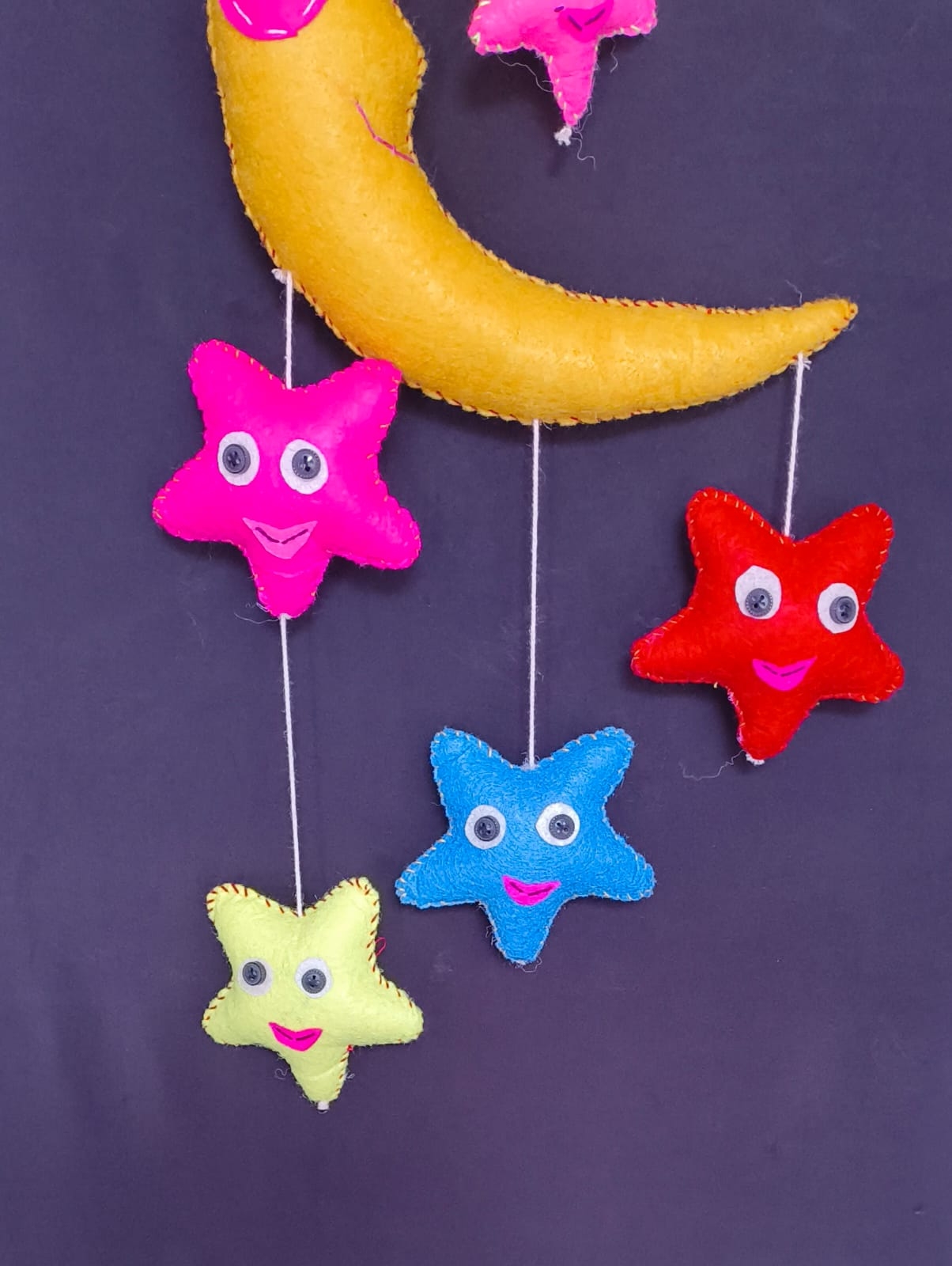 This handmade moon and stars wall hanging is crafted from soft felt fabric with bright colors and cute smiling faces. Lightweight and easy to hang, it is perfect for decorating kids’ rooms, nurseries, or gifting.