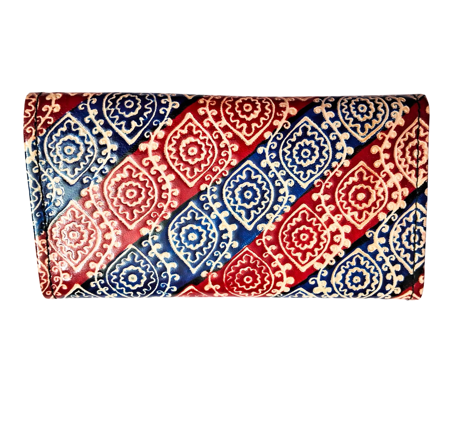 This purse is a classic example of age old Shantiniketan craft. It was introduced in West Bengal, India during the 1940s. The traditional motifs used for These Shantiniketan bags depict the rich cultural heritage of India. It derives its name from the place where it was first introduced – Shantiniketan. The Shantiniketan style evolved as a result of the Art Movement. These products have now become world famous for their applique, batik and embossed craft work. Moreover the process of burnishing the leather gives it an elegant sheen and brings out the colors. The embossing craft is an intricate process. After the final leather is made, it is then stitched into the desired product . Finally the product is coated with a lacquer finish for making the product shiny and long lasting.