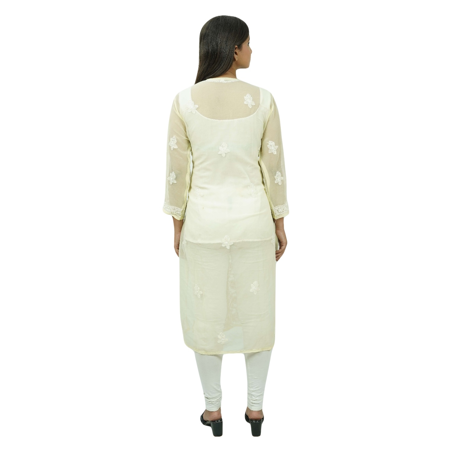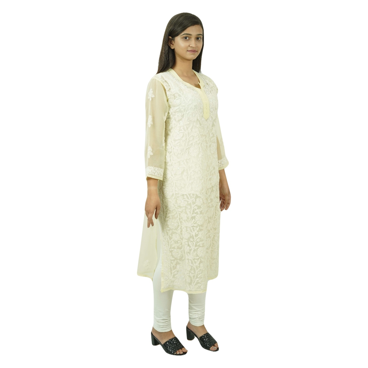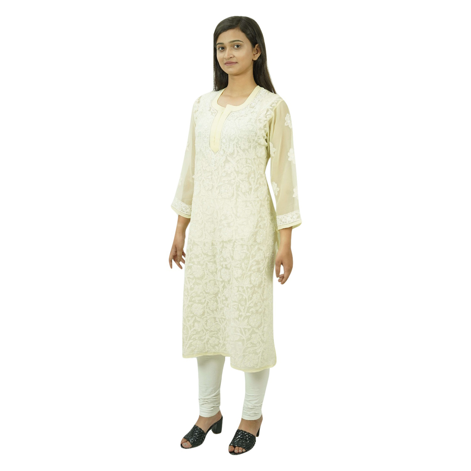 The White Georgette Chikankari Kurti is a beautiful and elegant kurti that is handcrafted in India. It is made from fine-quality cotton and is adorned with delicate floral motifs. The kurti is perfect for any occasion, from a casual day out to a formal event.