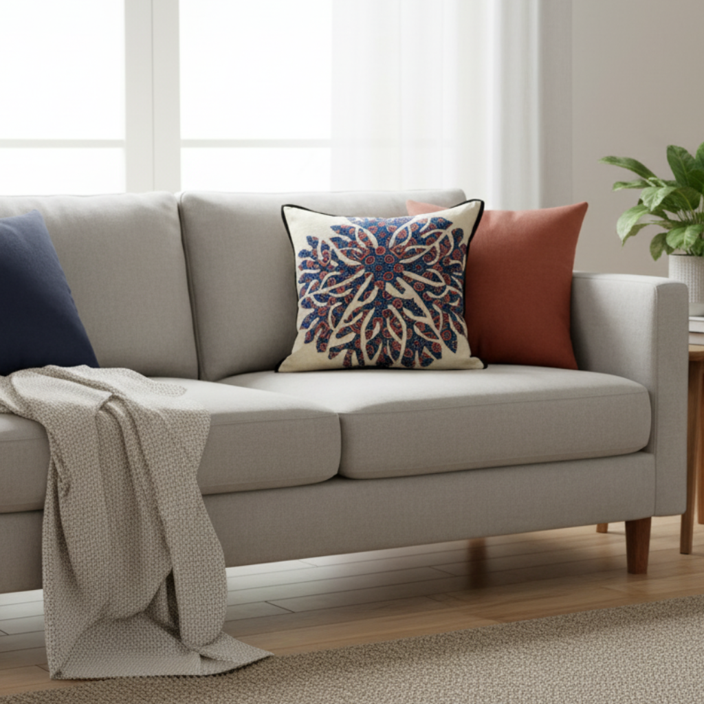 This white cushion cover with a striking blue applique design adds a stylish and contemporary touch to any living space. Made from soft, durable fabric, it works beautifully on sofas, beds, reading corners, and accent chairs. Available in 36 × 36 cm and 40 × 40 cm sizes, it fits standard cushion inserts and blends effortlessly with modern, ethnic, or boho-inspired décor themes. A perfect pick for home styling, festive decorating, or thoughtful gifting.