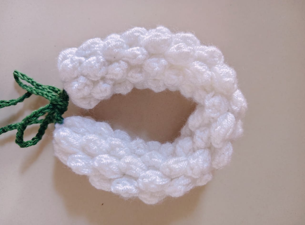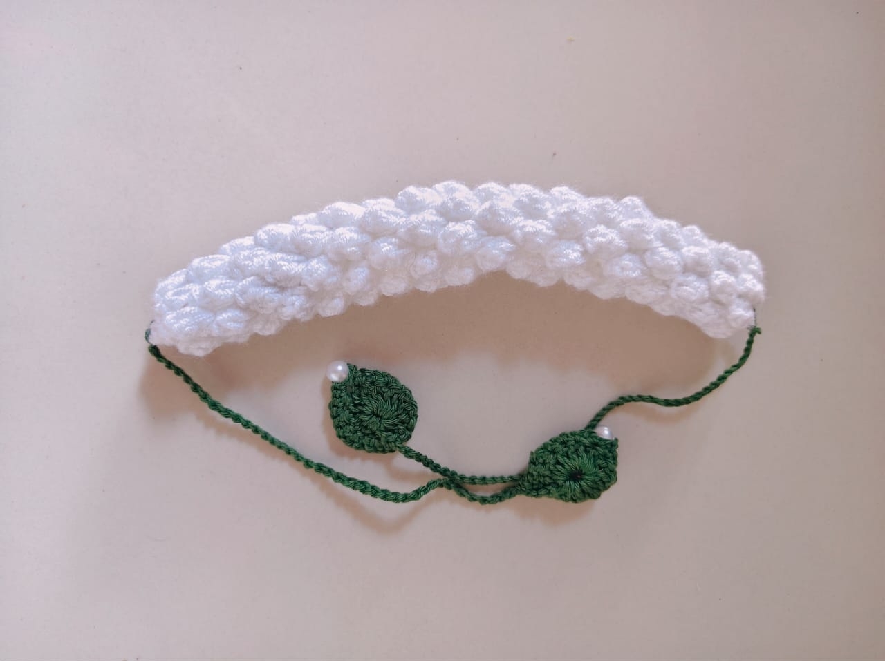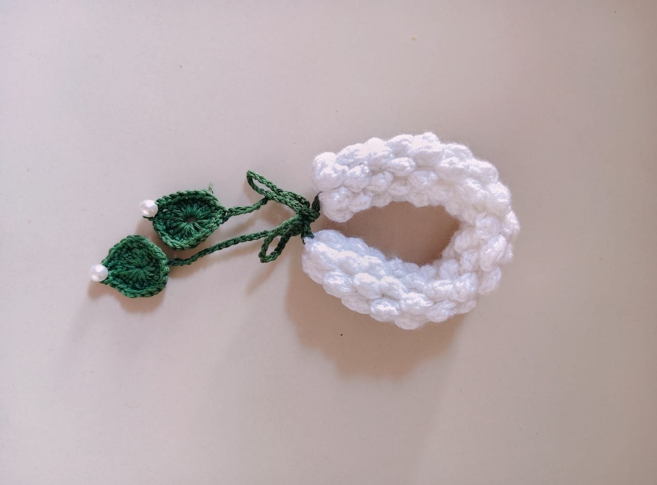 Celebrate timeless beauty with this handmade crochet gajra, lovingly crafted to resemble the elegance of jasmine blooms. Featuring soft white loops arranged in a circular design and finished with a braided green tie, this piece brings the charm of traditional floral adornments into a sustainable, reusable form.
