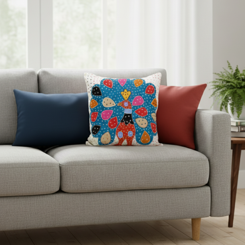 This white cushion cover showcases an intricate peacock applique design that adds a refined ethnic touch to any home setting. The soft, durable fabric pairs beautifully with modern, classic, or ethnic décor themes, making it ideal for sofas, beds, lounge corners, and accent chairs. Available in 36 × 36 cm and 40 × 40 cm sizes, it fits standard fillers and enhances living spaces with artistic charm. Perfect for festive décor, everyday styling, or thoughtful gifting.