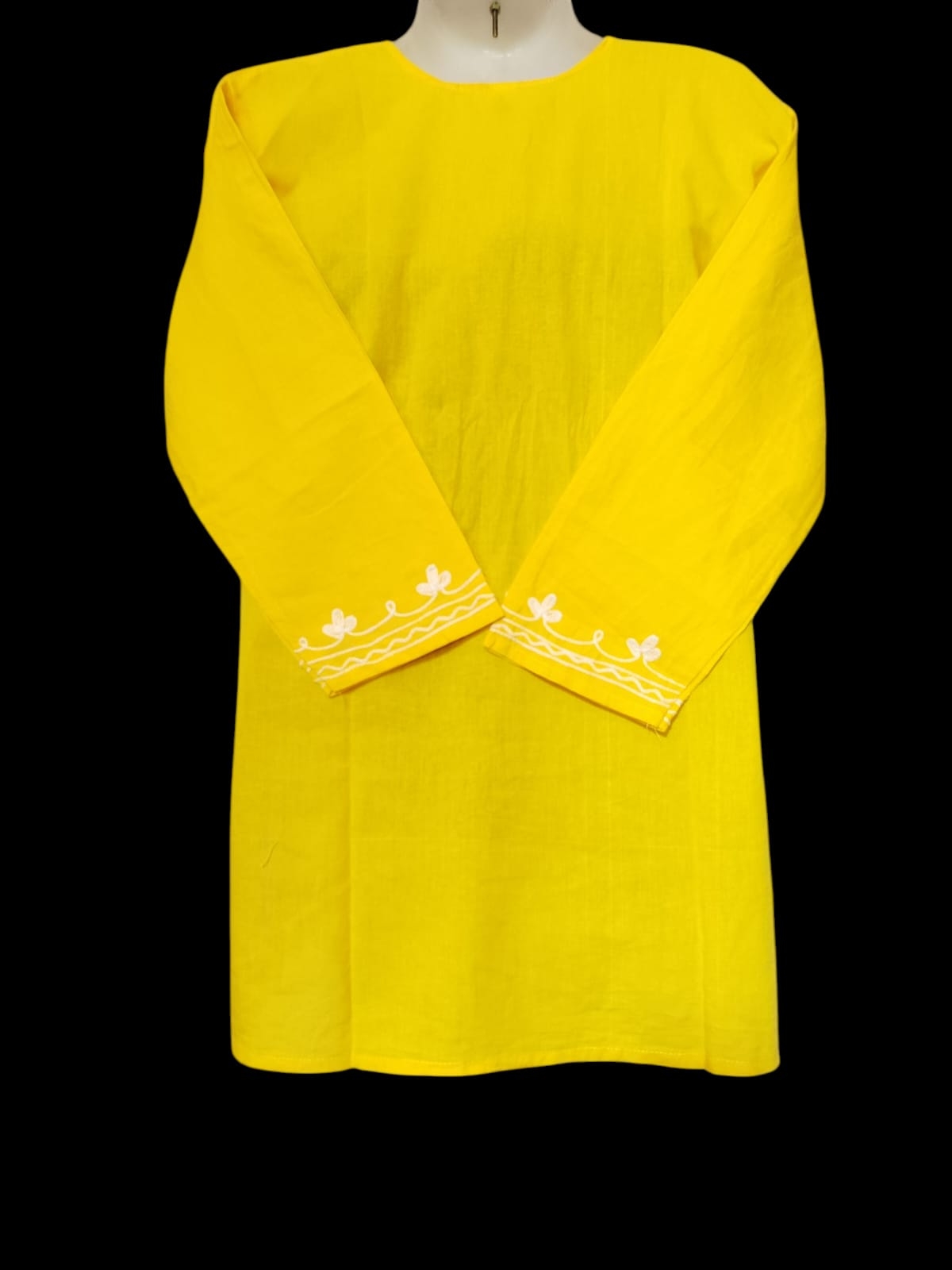 This yellow cotton kurti is a beautiful blend of elegance and comfort, perfect for women who love simple yet stylish ethnic wear. Crafted from high-quality breathable cotton fabric, it ensures maximum comfort for daily wear while keeping you cool and relaxed throughout the day. The kurti features exquisite white floral embroidery on the front panel, neckline, sleeves, and hemline, adding a touch of sophistication and charm to its overall look. The embroidery work highlights traditional craftsmanship, making it stand out as a graceful outfit.