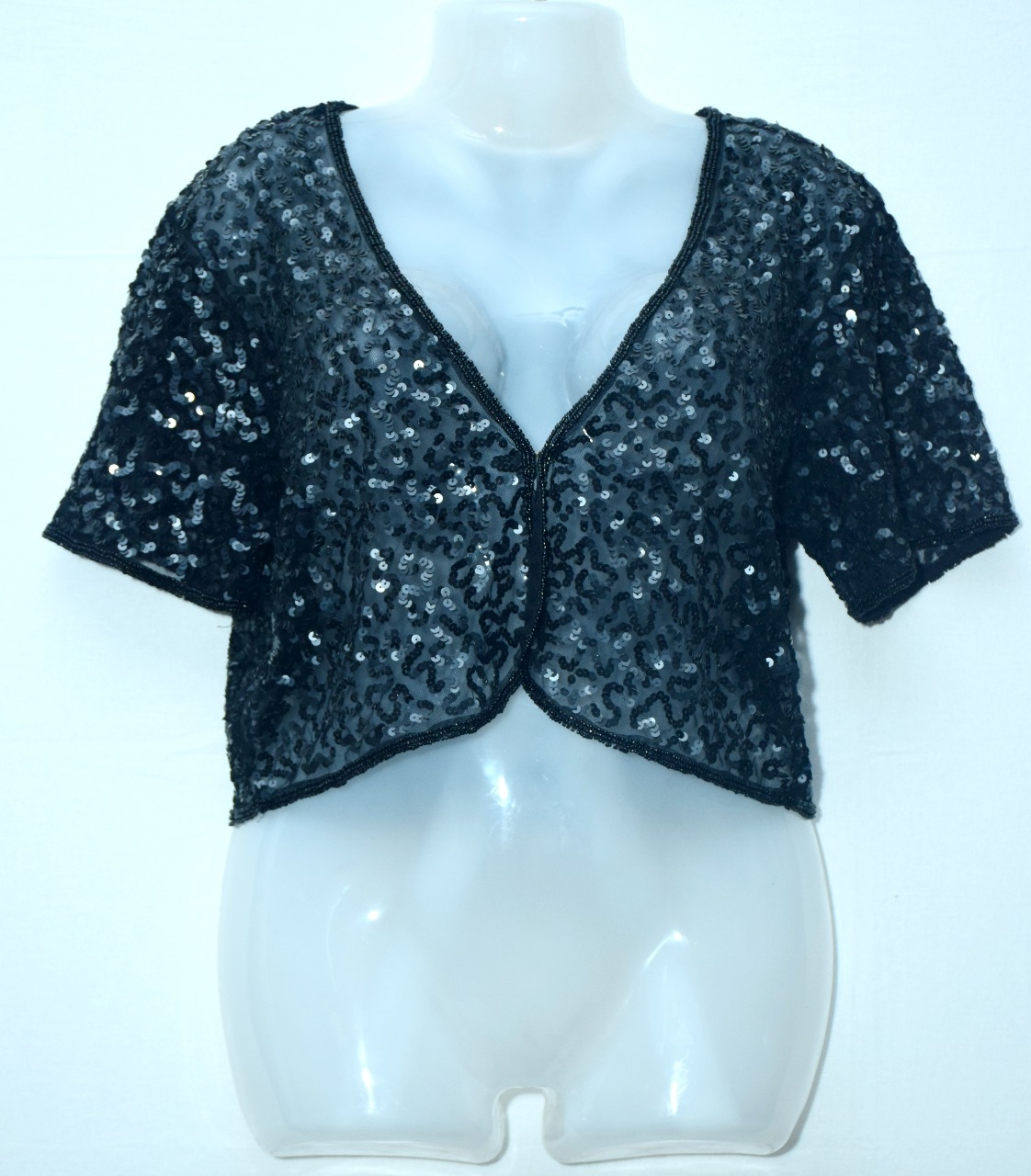 Chic black sequin shrug crafted from sheer mesh fabric, featuring elegant embroidery and short sleeves. Perfect for layering over dresses or tops to add a touch of sparkle and sophistication to your party or evening look.