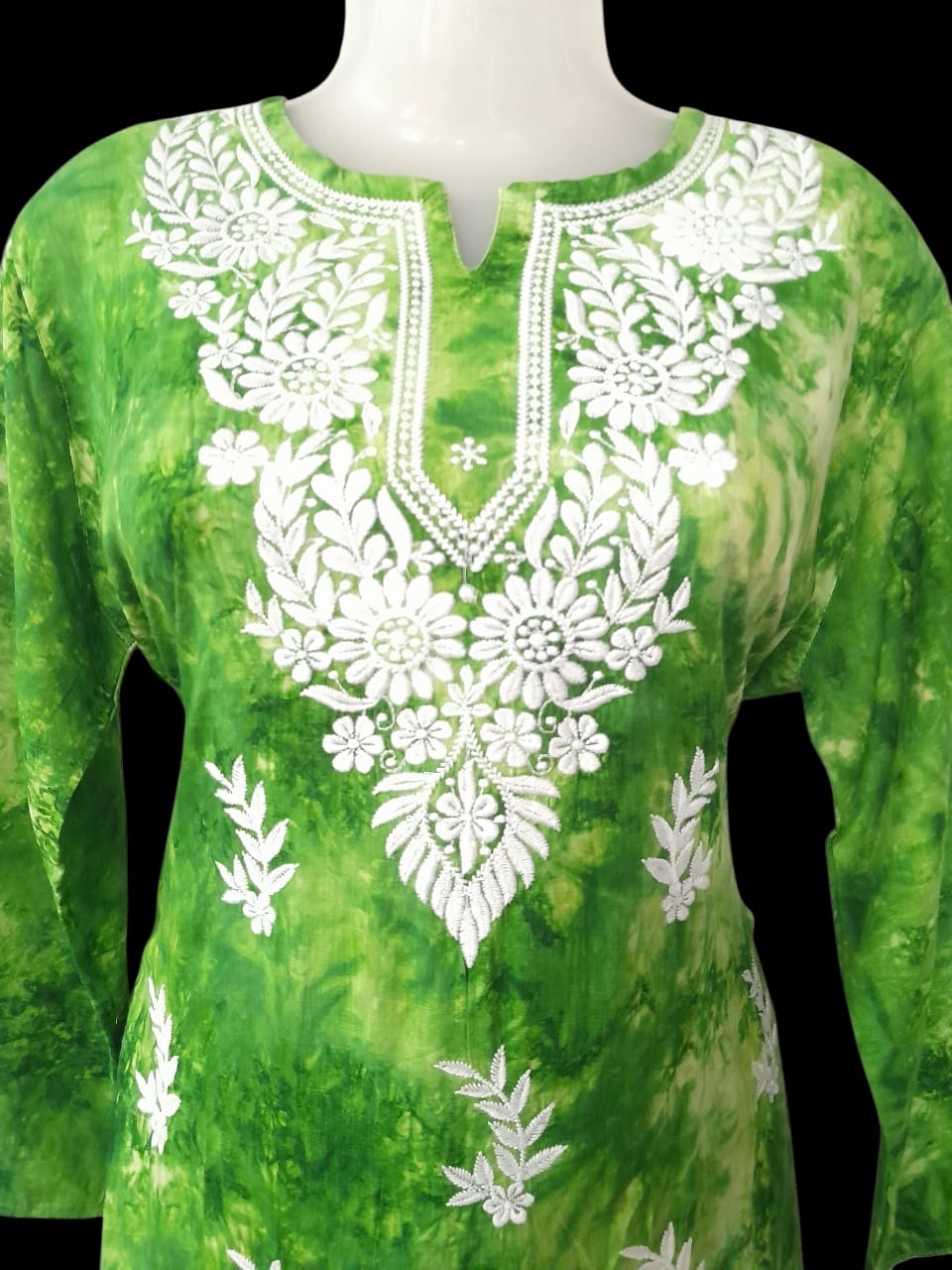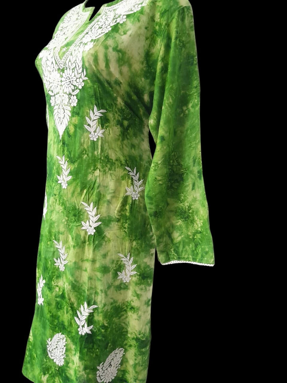 Color & Pattern: It features a vibrant green tie-dye pattern, creating a mottled, artistic effect on the fabric. Fabric: Typically crafted from soft and breathable materials like Malmal (mulmul) cotton or rayon, making it comfortable for various climates. Embroidery: The kurta is adorned with intricate white Chikankari embroidery, a traditional hand-embroidery style from Lucknow, Uttar Pradesh, India. The embroidery features floral and leafy motifs on the neckline, front panel, and sleeves. Style: It is a straight-cut, calf-length kurta with full sleeves and a round neck with a V-slit. Versatility: Suitable for both everyday wear and special occasions, embodying Indian craftsmanship and elegance.
