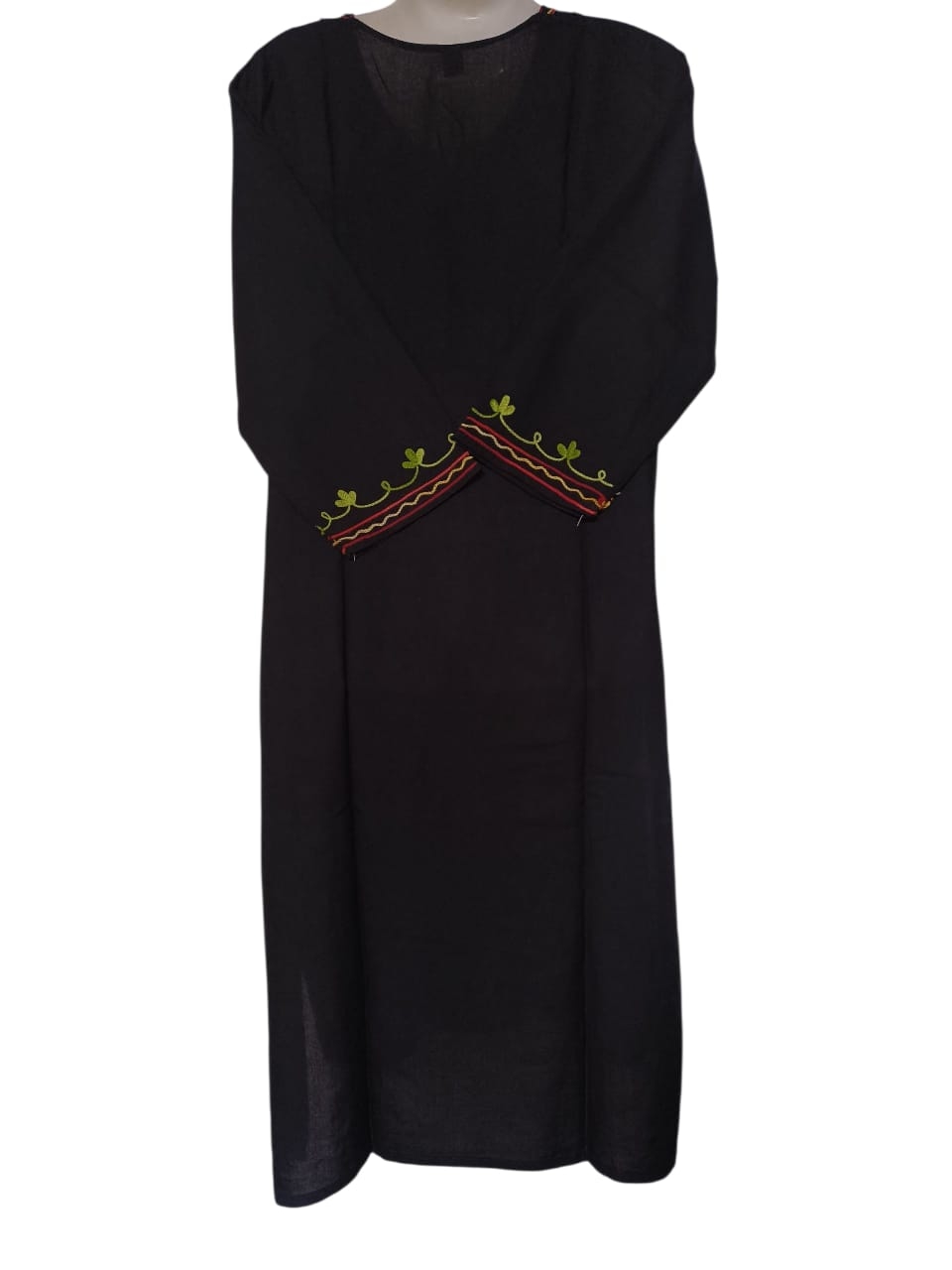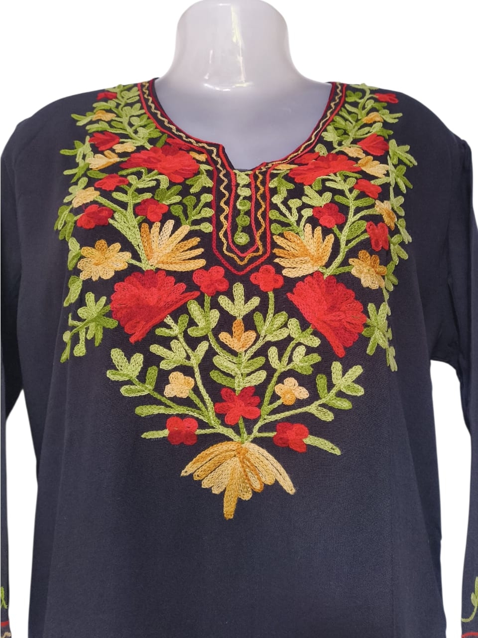 Design and Fabric: It is a black, straight-fit kurti or pheran, which is a traditional Kashmiri garment. The fabric is often described as Cashmilon or fine wool, designed to be warm yet lightweight. Embroidery: The garment is decorated with intricate Aari embroidery, a type of chain-stitch work. The embroidery features floral and vine patterns, primarily around the neck, cuffs, and hemline. The colors of the embroidery are vibrant, including red, yellow, and green, which stand out against the black fabric. Fit and Style: It has a loose and flowing silhouette with long sleeves and a mandarin collar. The length typically falls to the knee.