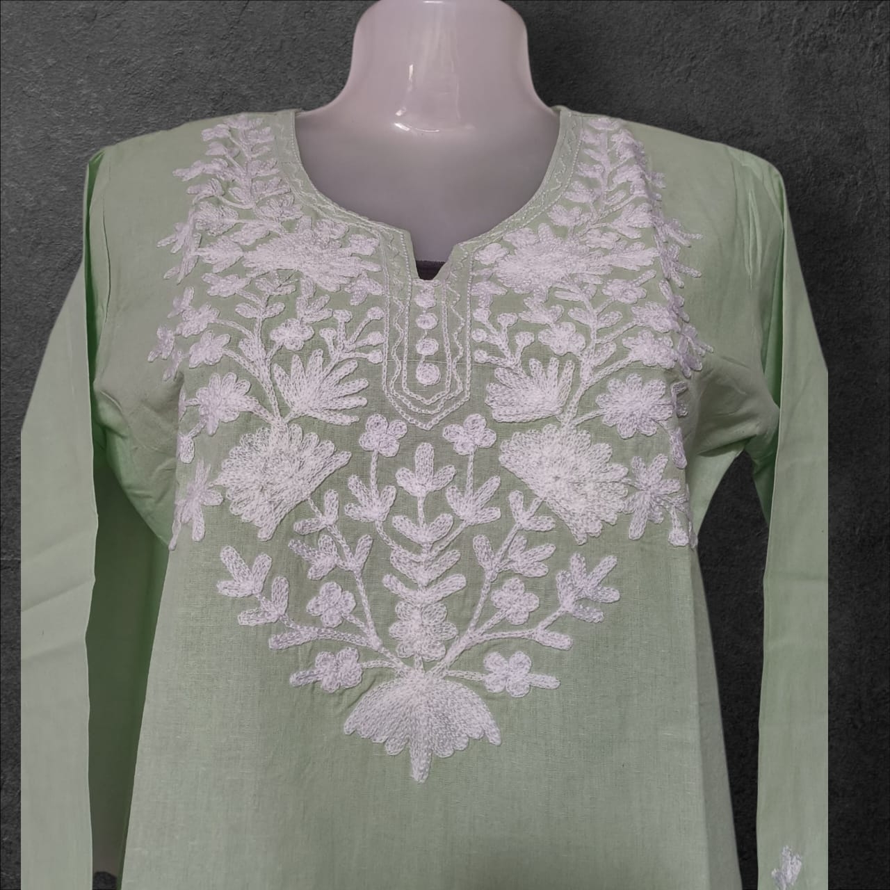 The kurti is a light green Chikankari kurti. It features intricate white embroidery, a traditional Indian craft, on a cotton or rayon-cotton blend fabric.