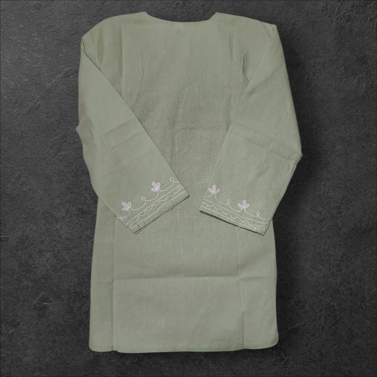 Style: It is a short-length kurti with three-quarter sleeves. Fabric: The material is a soft, breathable cotton or rayon-cotton blend, making it comfortable for casual wear.Embroidery: The main feature is the delicate Chikankari hand embroidery, with floral and traditional patterns concentrated on the yoke, sleeves, and hem.
