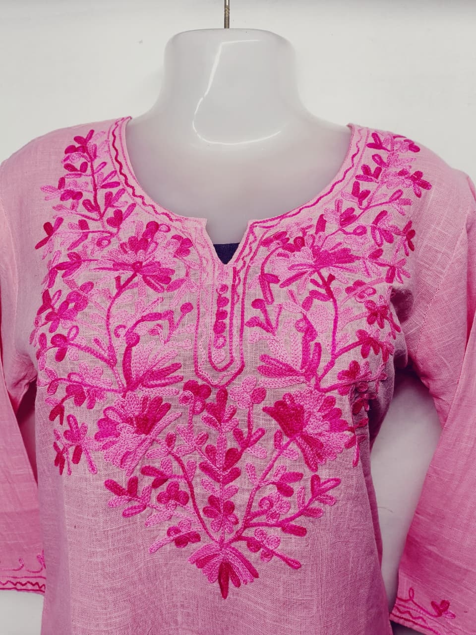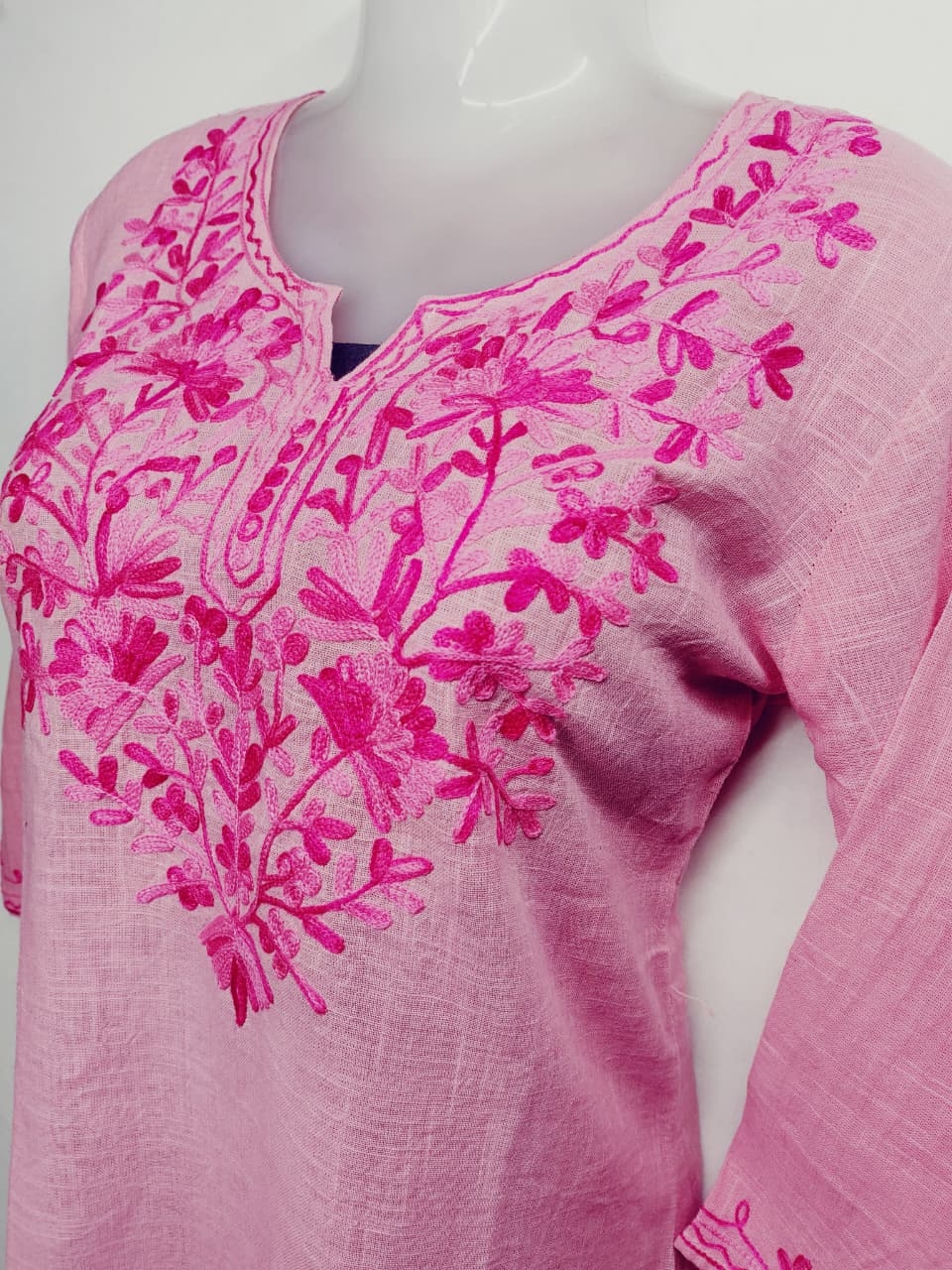 Graceful light pink cotton kurti featuring elegant dark pink floral embroidery on the front and sleeves. Designed with a round notch neckline and 3/4th sleeves, this kurti is perfect for casual outings, office wear, and ethnic gatherings