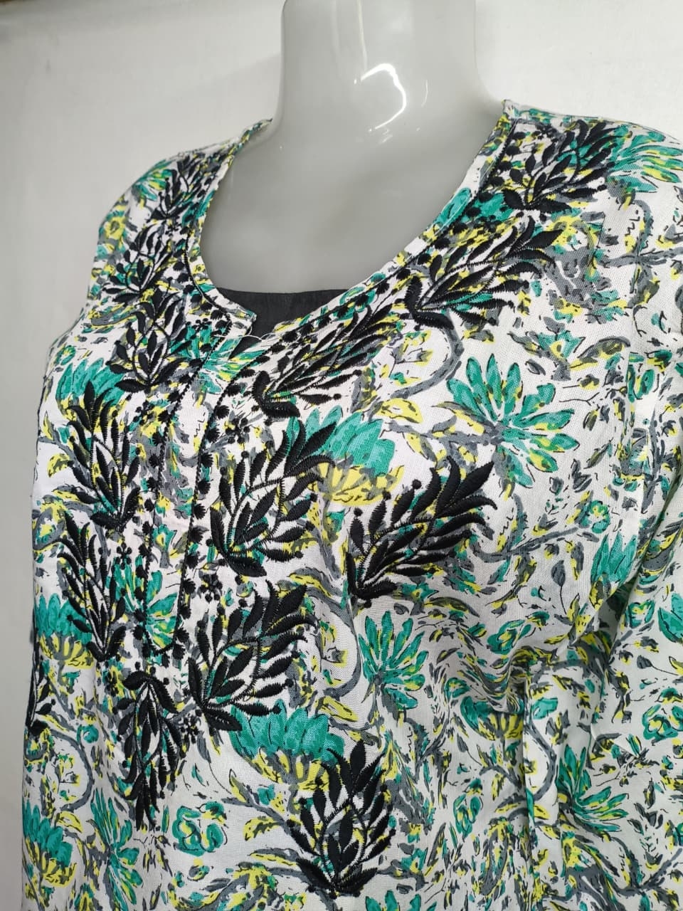 Beautiful white cotton kurti with multicolor floral print and elegant thread embroidery on the yoke. Featuring a round notch neckline, 3/4th sleeves, and side slits, this kurti is perfect for casual outings, daily wear, or office style.