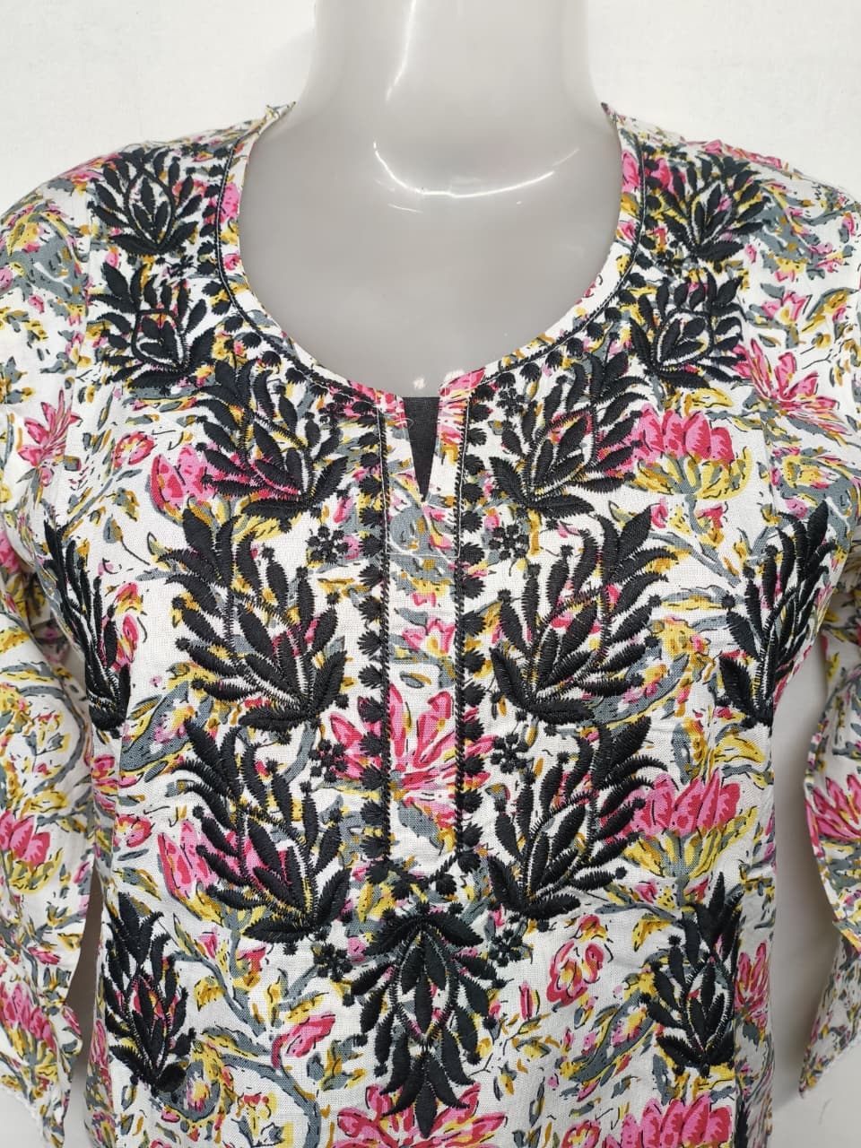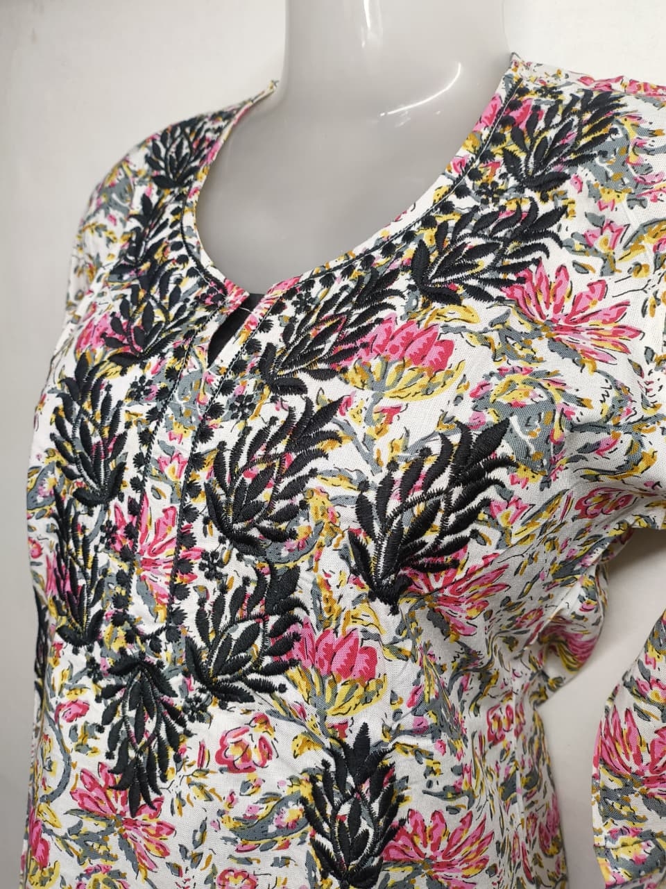 Beautiful cotton kurti with a white base, enhanced by multicolor floral block prints and rich black thread embroidery on the neckline and front. Designed with a round neck, 3/4th sleeves, and lace edging, this kurti offers a perfect blend of comfort and elegance. Suitable for casual outings, office wear, and festive occasions.