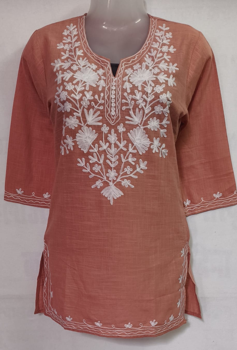 Elegant grey cotton kurti adorned with beautiful blue floral embroidery on the front, sleeves, and hem. Designed with a round neck and slit, 3/4th sleeves, and side slits for comfort, making it perfect for casual and ethnic wear.