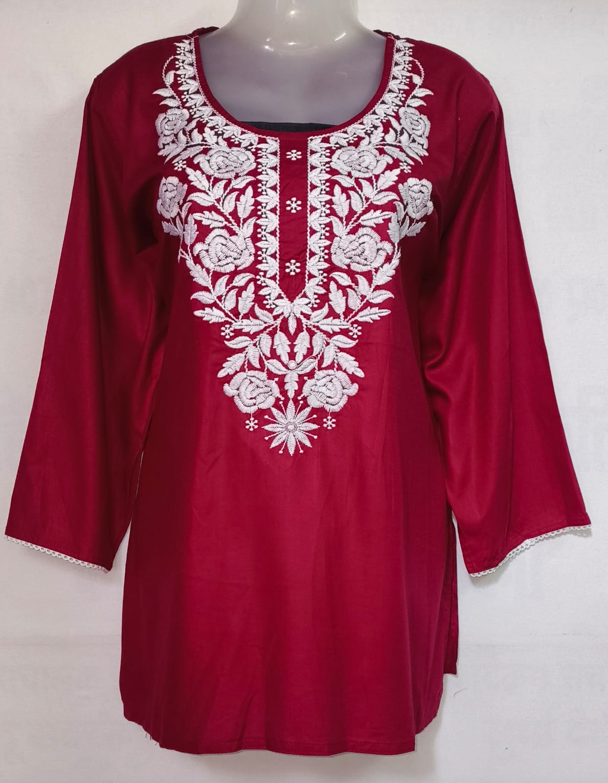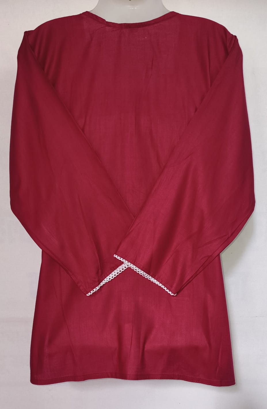 Elegant maroon kurti adorned with beautiful white floral embroidery on the front. Made from soft cotton blend fabric, it features a round neck, full sleeves with lace edging, and a comfortable fit. Perfect for casual outings, office wear, or festive occasions.