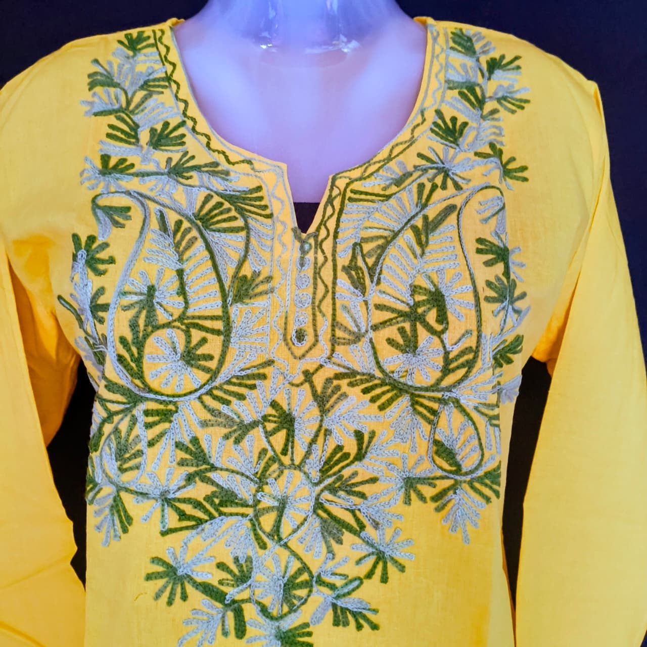 Brighten up your ethnic wardrobe with this vibrant yellow cotton kurti featuring beautiful floral embroidery in green and blue. Designed with a round neckline and full sleeves, it offers both comfort and elegance. Ideal for casual outings or festive occasions, this mid-thigh length kurti pairs perfectly with leggings or jeans.