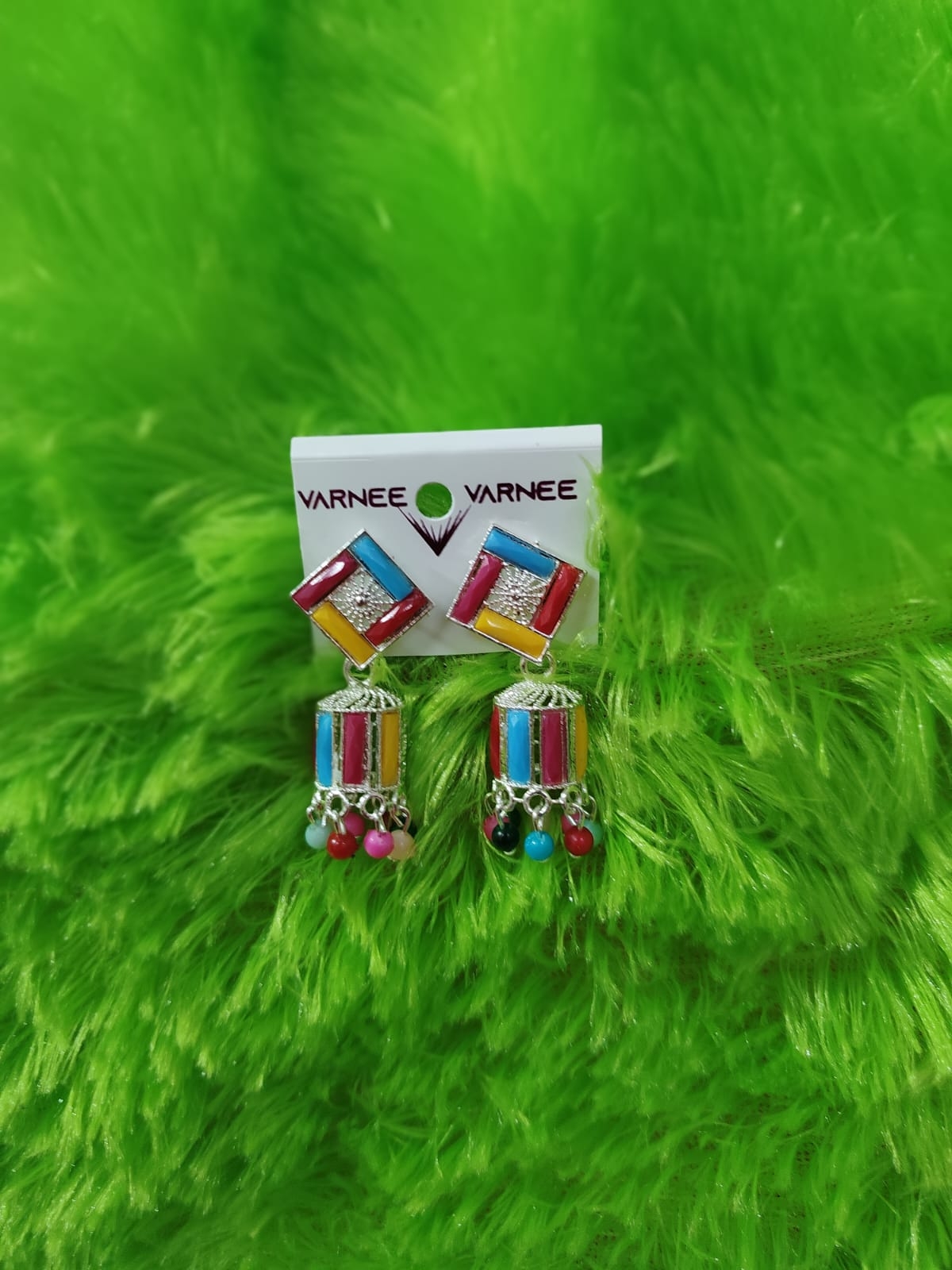 Add a pop of color to your style with these Varnee multicolor enamel dangle earrings. Designed with a geometric square top, vibrant cylindrical drops, and colorful beads, these earrings bring a perfect blend of ethnic charm and modern fashion. Lightweight and stylish, ideal for festive, party, or casual wear.