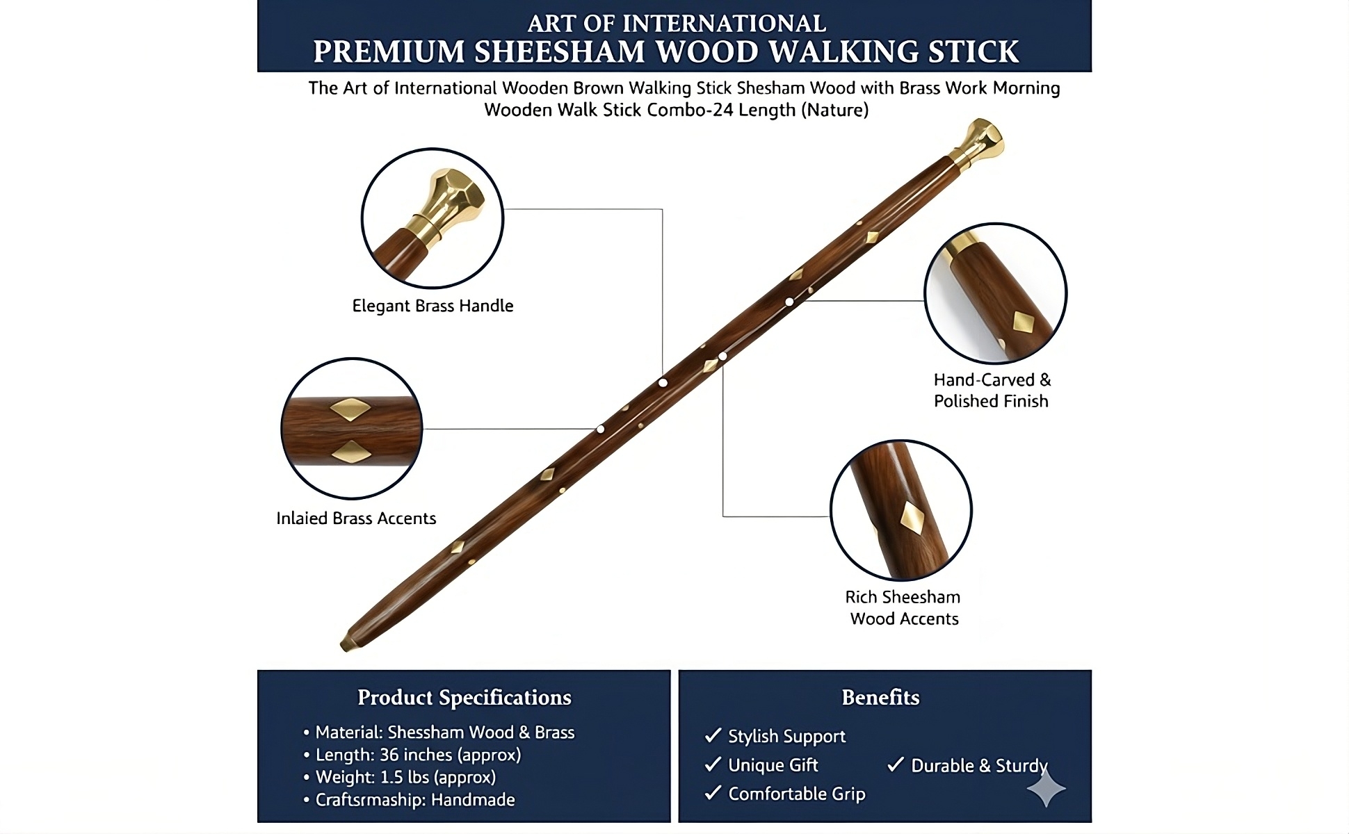 - Elegant Brass Work: Hand-engraved brass detailing adds a vintage charm to your walking experience.