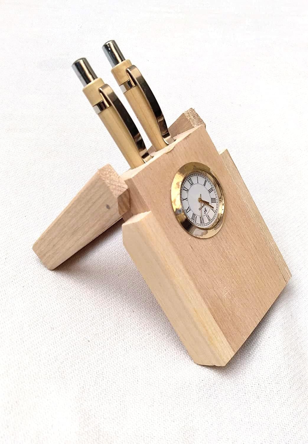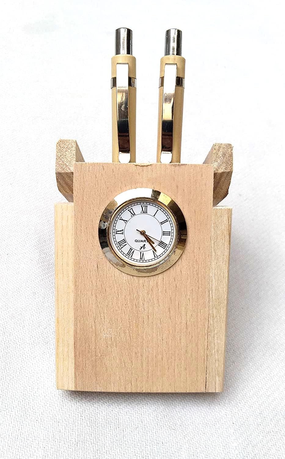 Wooden Pen Stand With Watch | Beige | 15x8x6 cm