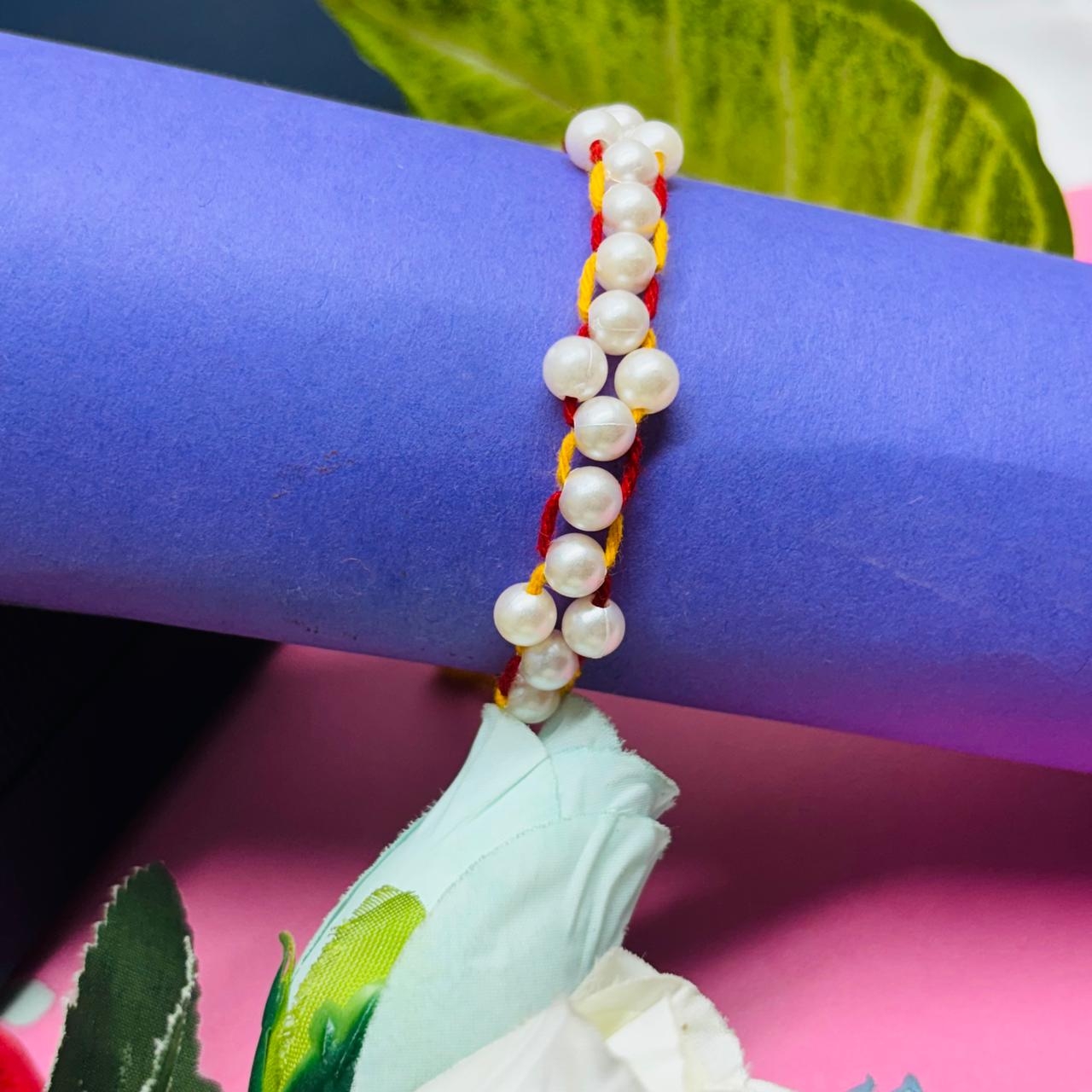 Traditional Handmade Pearl Rakhi – Red and yellow threads adorned with delicate white pearl beads.