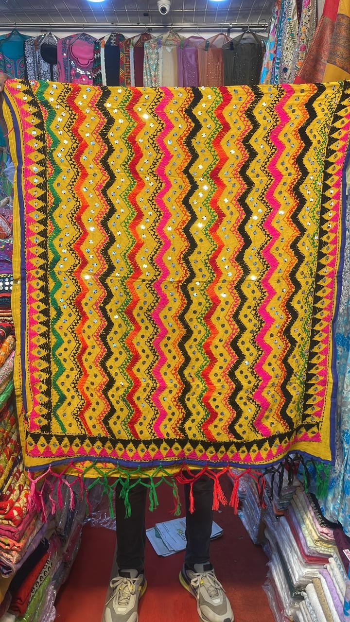 Phulkari dupattas are traditional dupattas made by artisans from villages in Punjab. These skilled artisans work by hand using multicoloured threads to create beautiful, unique pieces.