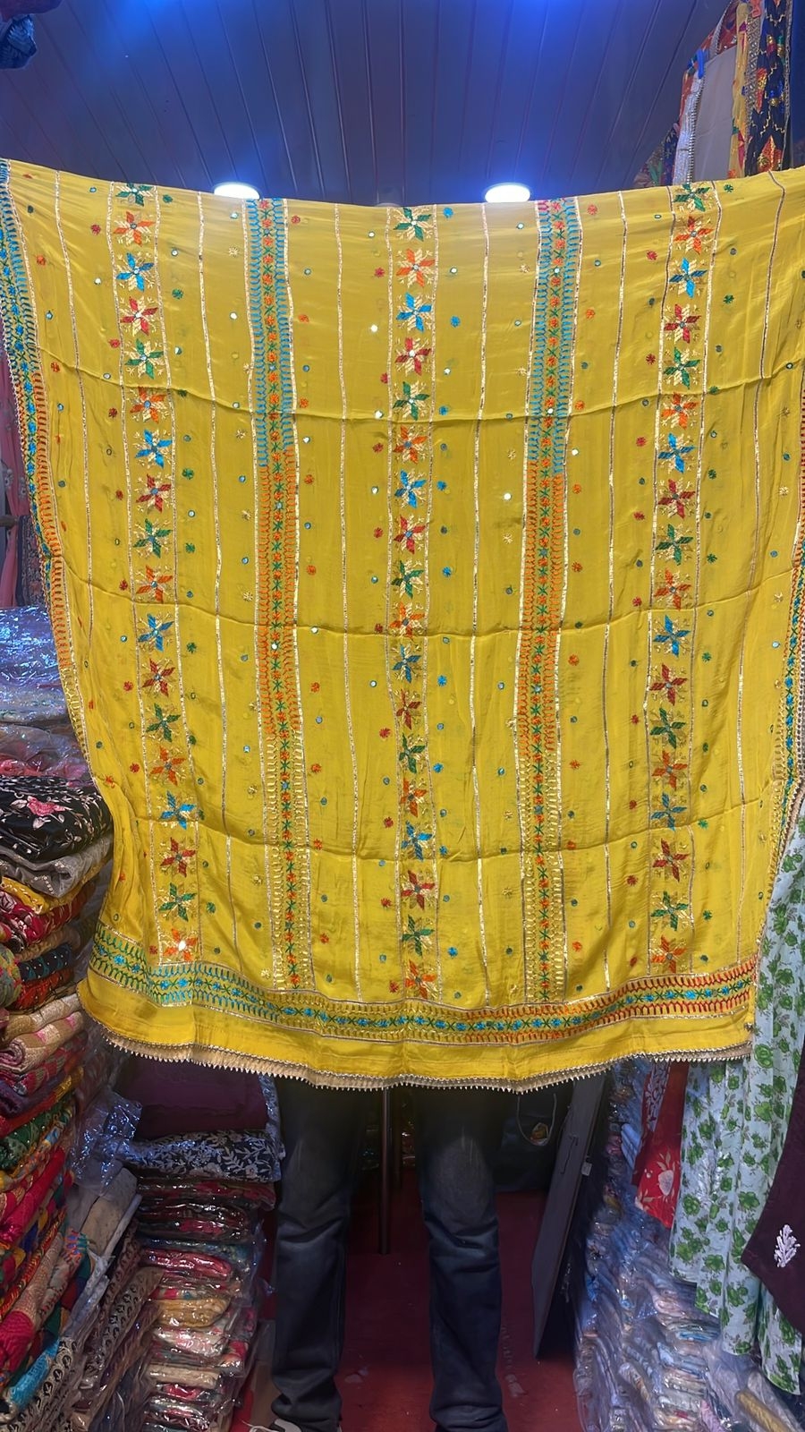 This beautiful phulkari dupatta on Chinon Chiffon fabric has been hand embroidered with wool thread and sequins.