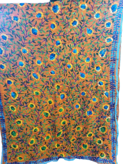 Phulkari (Punjabi: ਫੁਲਕਾਰੀ) refers to the folk embroidery of the Punjab. Although Phulkari means floral work, the designs include not only flowers but also cover motifs and geometrical shapes.The main characteristics of Phulkari embroidery are use of darn stitch on the wrong side of coarse cotton cloth with coloured silken thread. Punjabi women create innumerable alluring and interesting designs and patterns by their skilful manipulation of the darn stitch